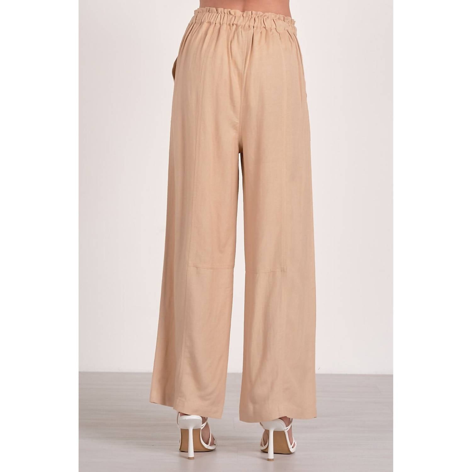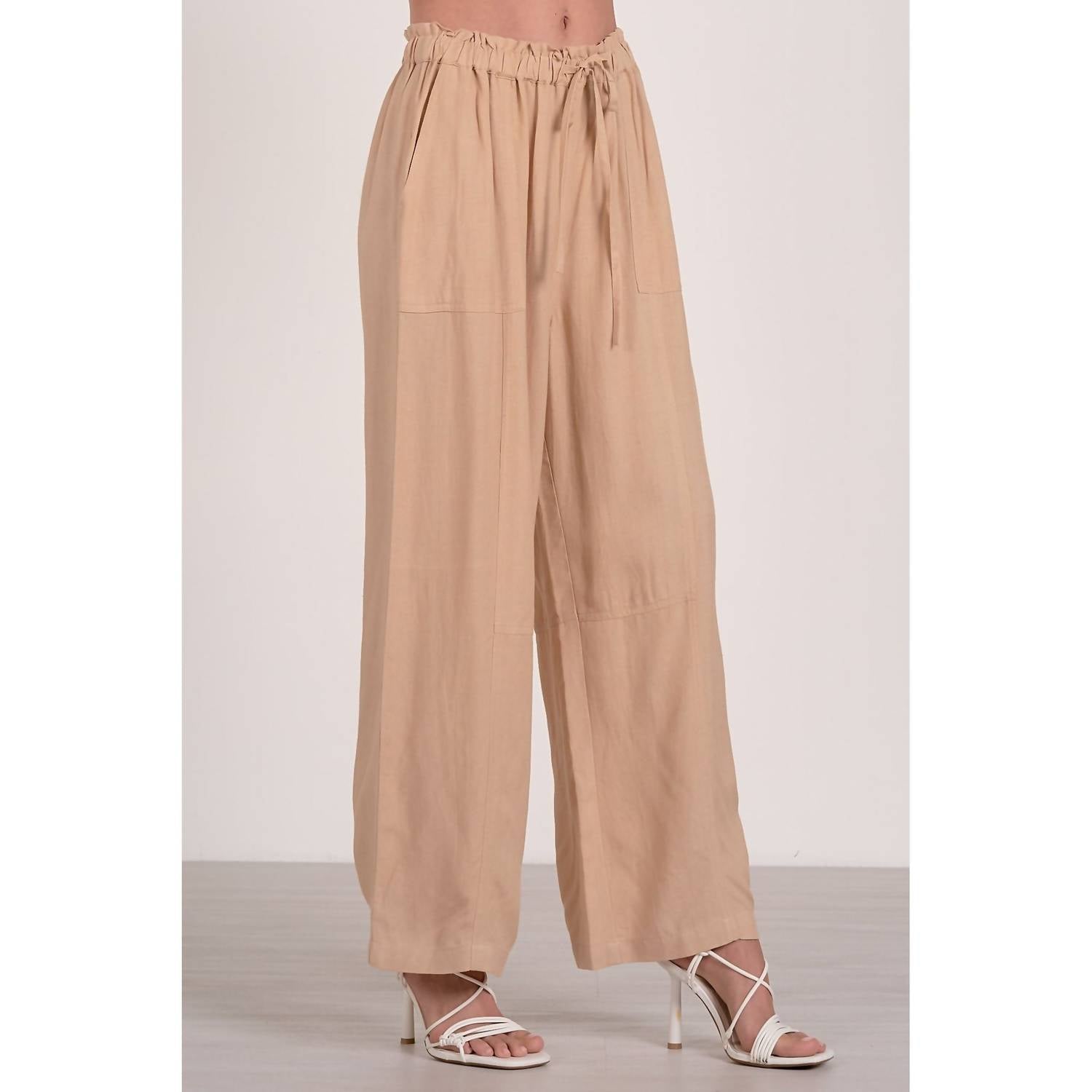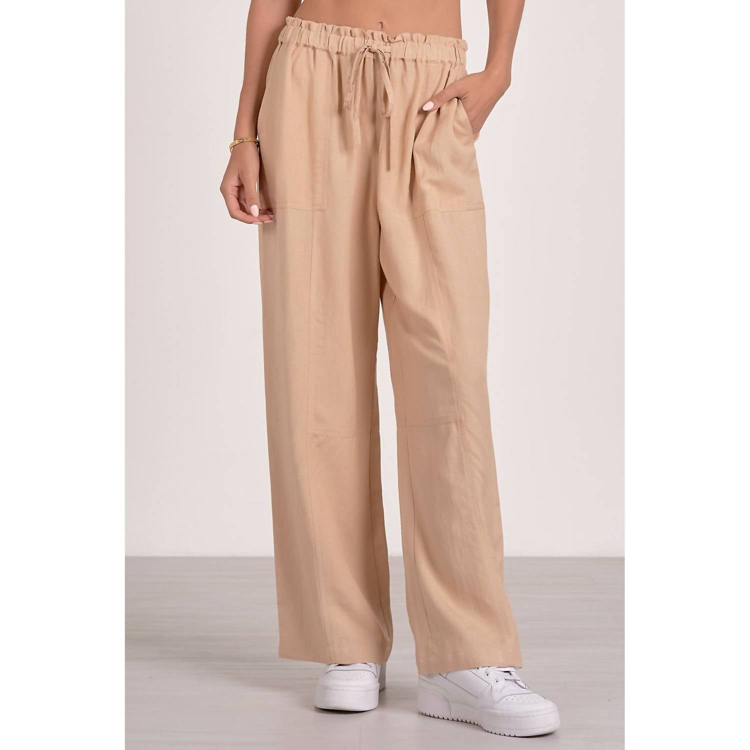 Meet the Lola Linen Pant by ELAN, a chic addition to your spring wardrobe in a sophisticated sand color. Designed for women, these wide-leg pants feature a relaxed fit and a mid-rise waist with an adjustable drawstring for comfort. Made from a blend of 55% Viscose and 45% Linen, they come with practical pockets and a pull-on closure for easy wear. Care instructions suggest hand washing in cold water and line drying, while the model, standing 5'10" with a 34" bust, 24" waist, and 36" hips, is wearing a size small, ensuring a true-to-size fit.