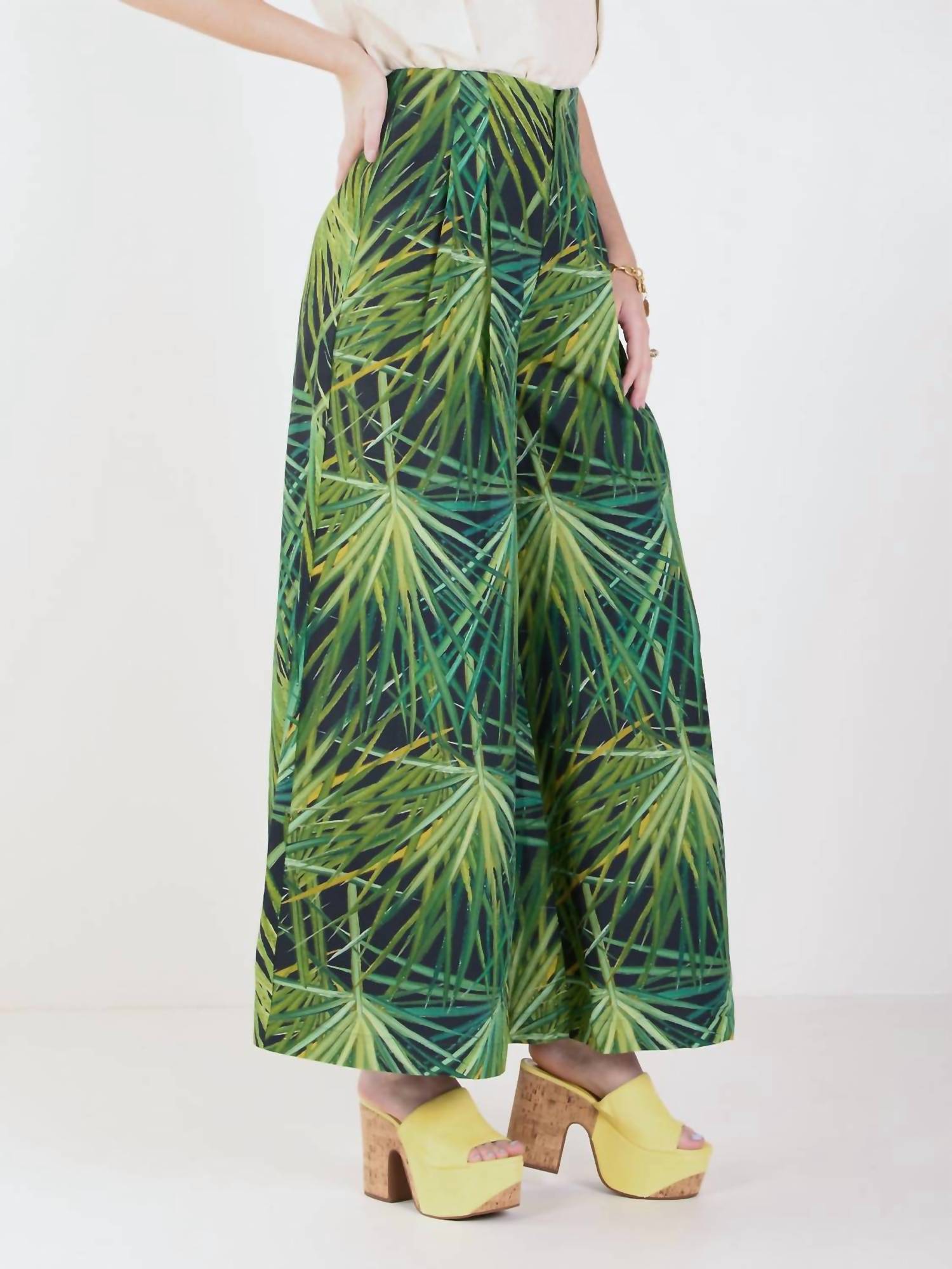 Elevate your vacation wardrobe with these high-waisted pants designed for a breezy, sophisticated look. The relaxed, wide-leg silhouette offers effortless movement, while a hook-and-eye closure provides a smooth, tailored finish. Artistic detailing adds a unique touch, making this pair a standout choice for warm-weather style.