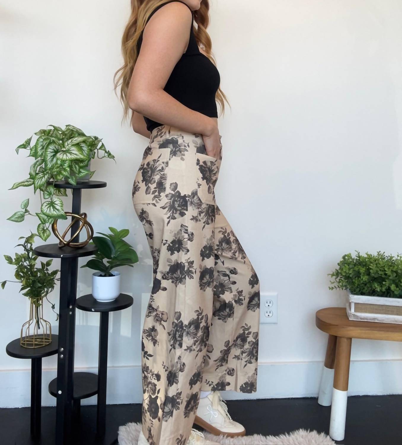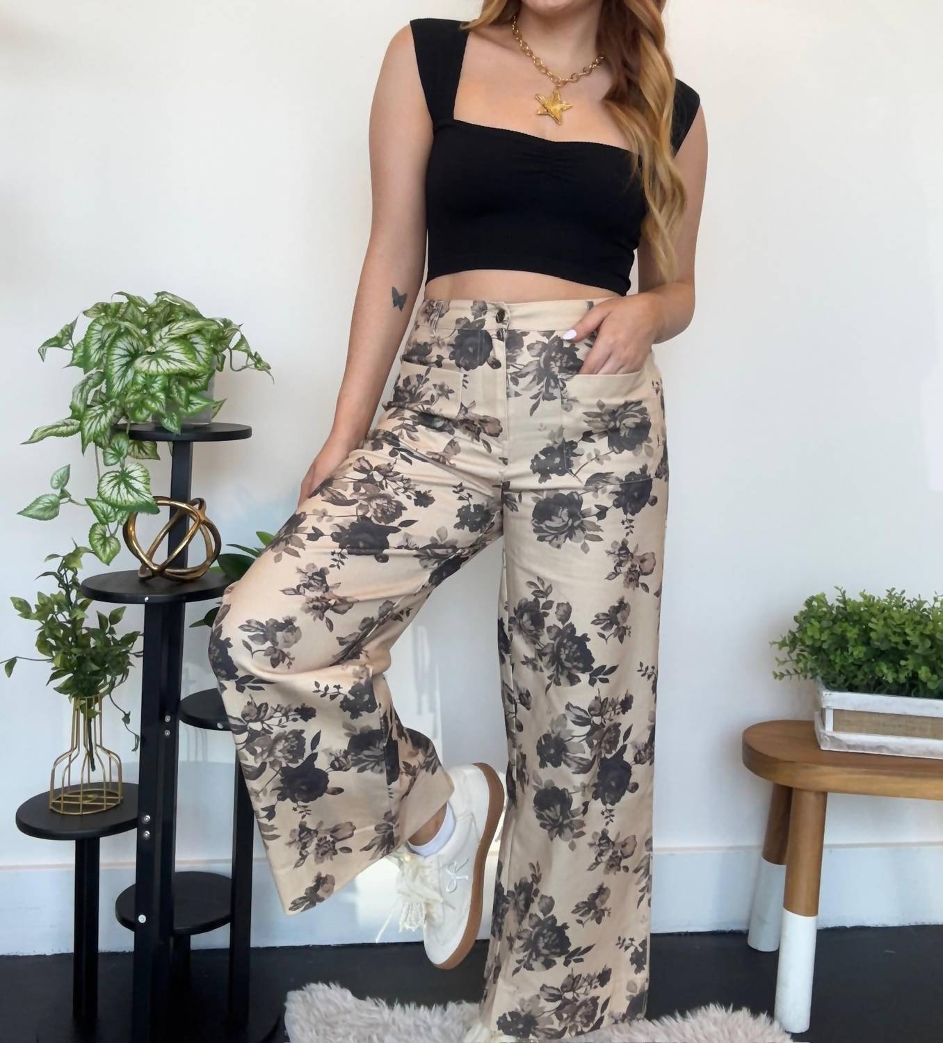 Embrace playful charm with the Rose Garden Wide Leg Pants by Entro, designed in a white multi floral pattern. These high-rise, relaxed fit pants are crafted from a 95% cotton and 5% spandex blend, featuring a zip closure for added convenience. The wide-leg silhouette and oversized pockets make them a standout choice for any summer occasion, adding a boho chic flair to your ensemble. Care instructions include machine washing and tumble drying.