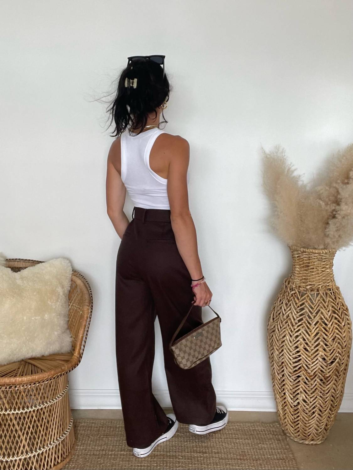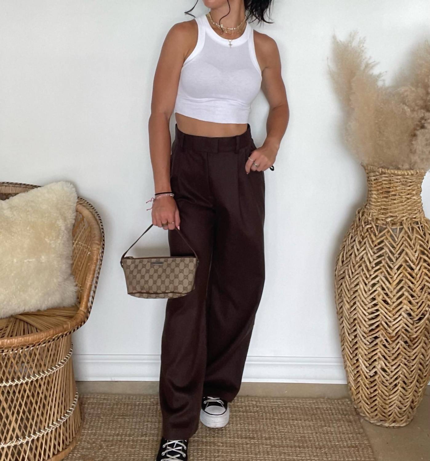 Introducing the Nicole Wide Leg Pants by FRNCH, crafted for a minimalist and elegant look in a rich Chocolate Brown hue. These pants feature a high-rise waist with practical belt loops and a convenient zipper closure, ensuring a relaxed fit through their wide-leg style. Made from a luxurious blend of 70% Polyester and 30% Wool, these pants blend comfort with sophistication. Perfect for spring engagements or Thanksgiving gatherings, these imported pants require dry cleaning to maintain their quality.