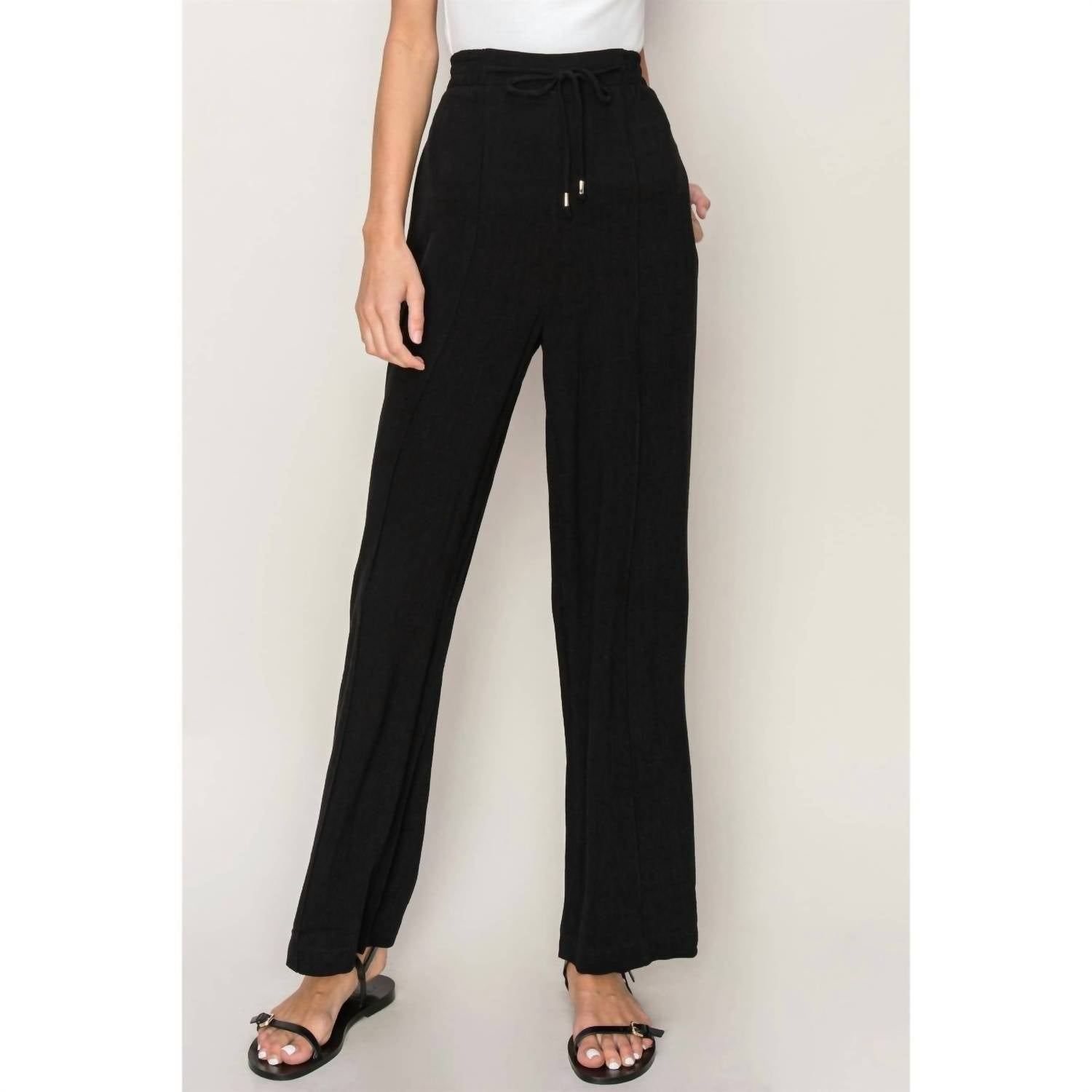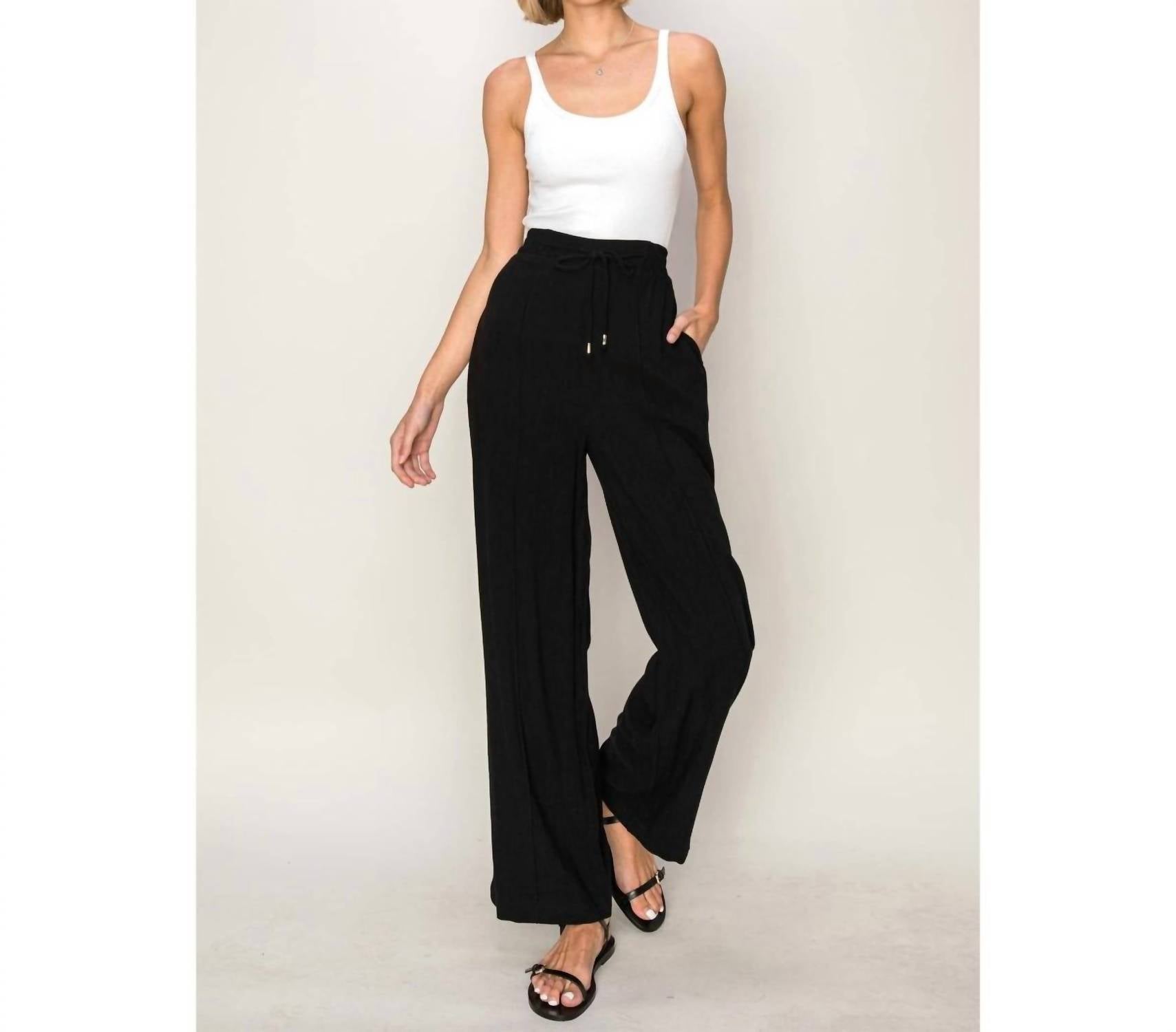 Elevate your style with the After Work Linen Blend Pants by HYFVE, crafted for a chic yet comfortable fit. These black wide-leg pants feature a high-rise waist with a convenient drawstring closure and a sophisticated pintuck front. Composition: 85% Rayon, 15% Linen. Care: Hand wash and line dry.