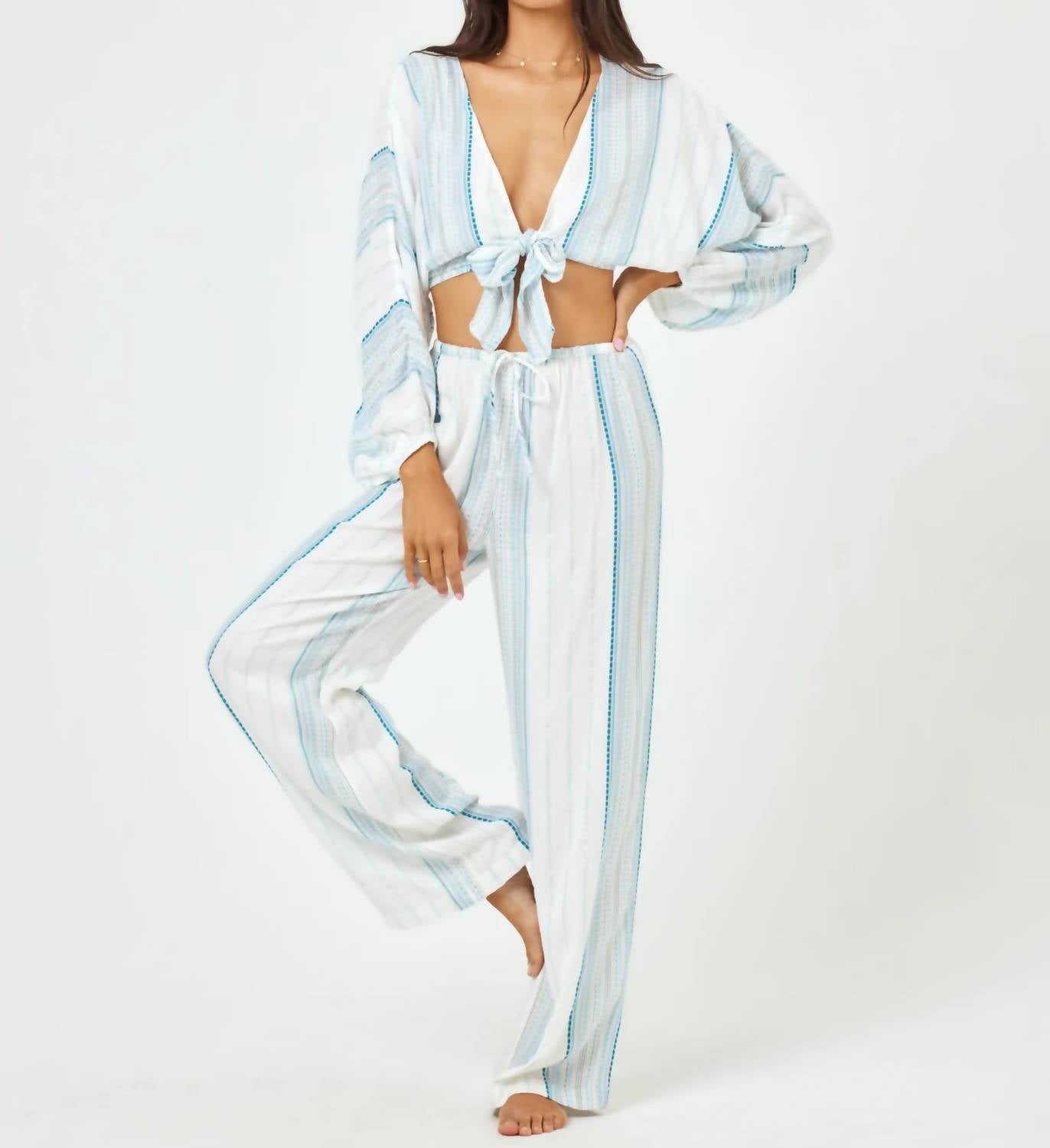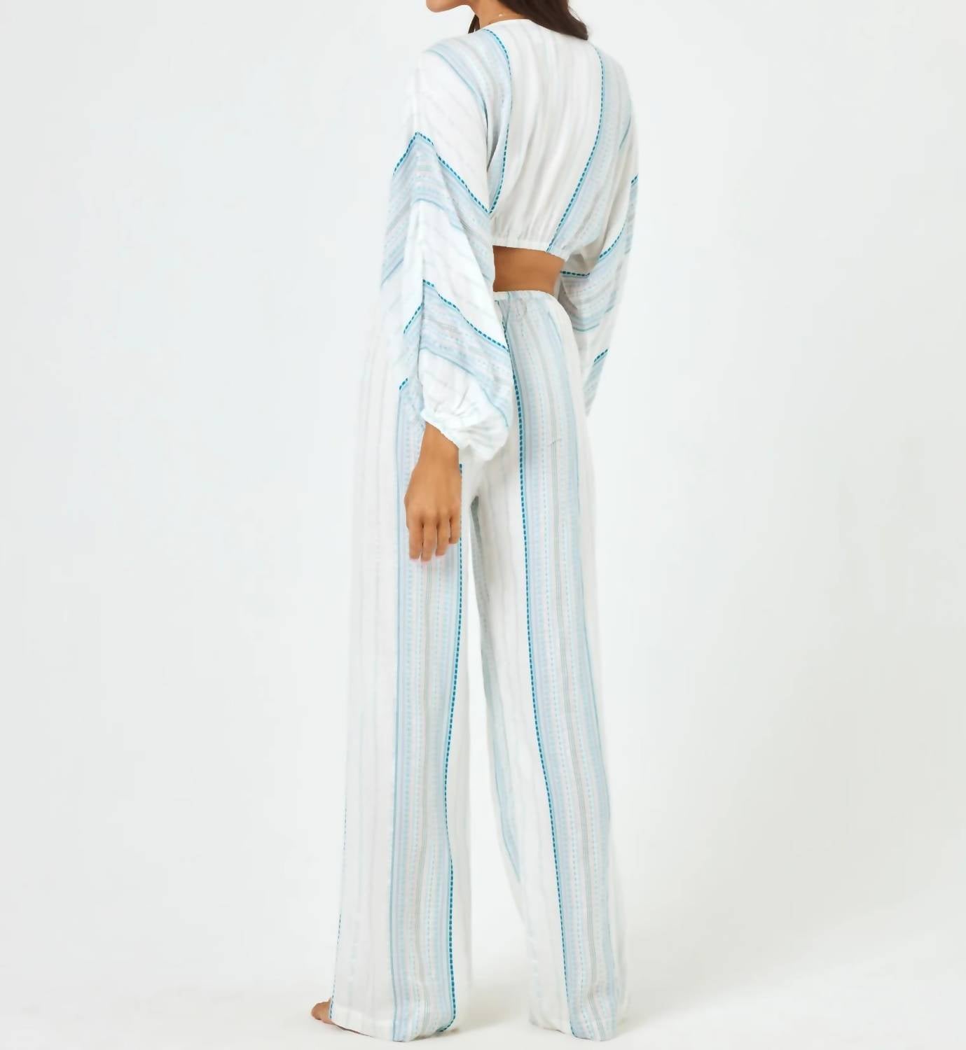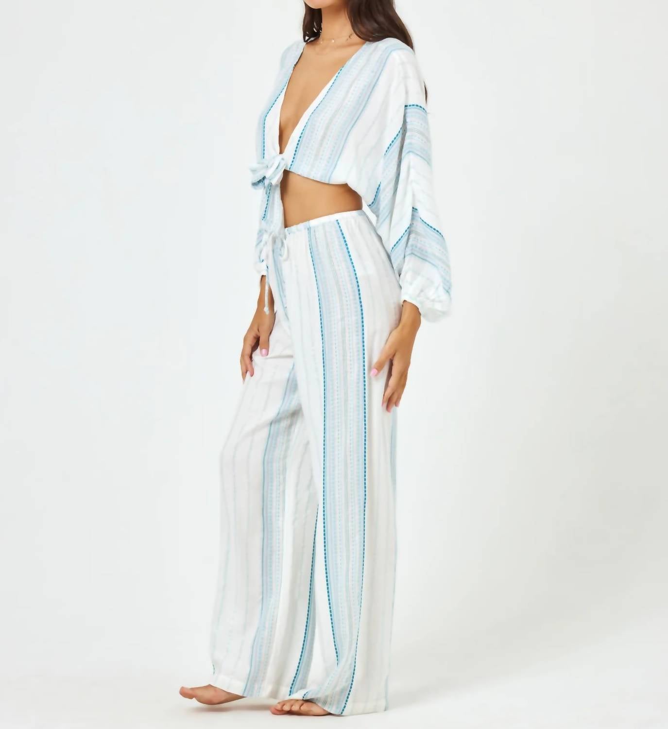 Step into style with the Lily Pants by L*SPACE, a perfect blend of comfort and flair in the eye-catching "Island Dreams" stripe pattern. These pull-on pants feature a high-rise, wide leg silhouette with a drawstring waistband, allowing for a customizable fit. Crafted from 99% Viscose and 1% Metallic, they boast a subtle shimmer ideal for a boho-chic summer beach day. Care for these delicate pants by hand washing in cold water and laying flat to dry.