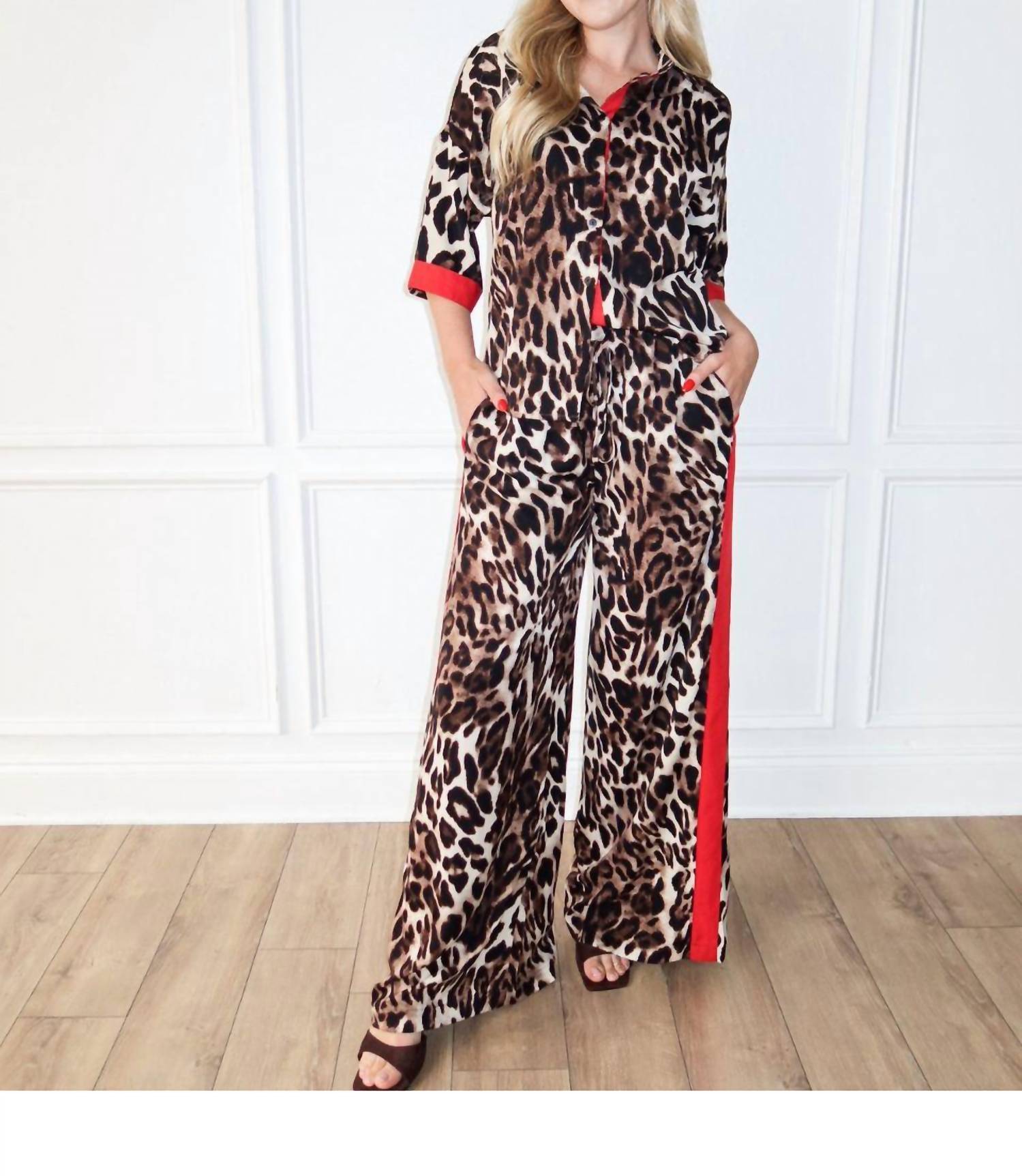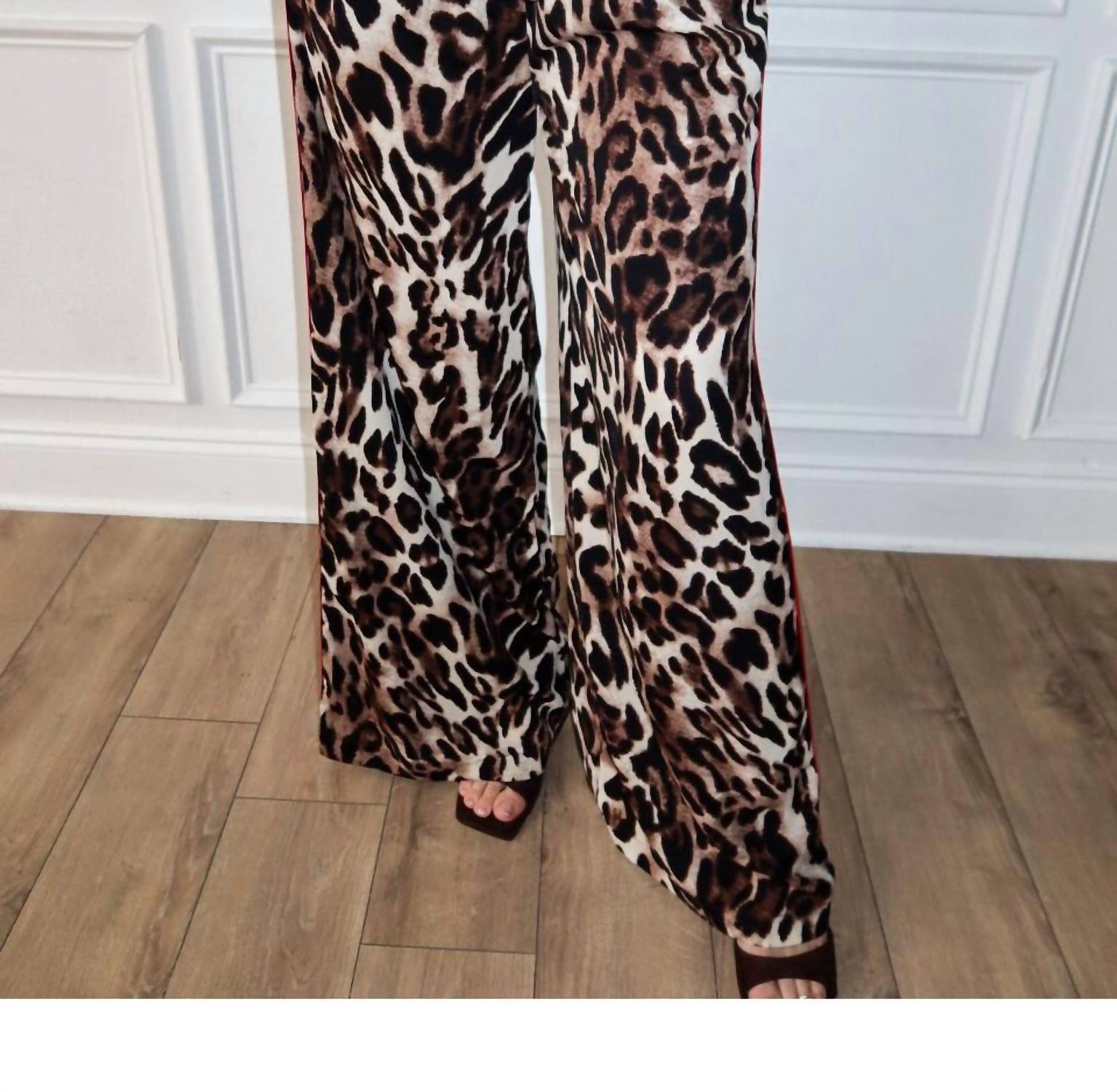 Introducing the Wild Card Wide Leg Pants by Q2, a statement piece in a striking leopard print designed for confident and bold styling. These pants feature short sleeves and a relaxed-fit pull-on design with wide legs. Made from a soft, breathable 100% Polyester, they come with pockets for added convenience. Care instructions include hand wash in cold water and line dry to maintain their vibrant style. Available in sizes Small (fits 0-4) and Medium (fits 6-10), the model at 5'7" is wearing a size Small.