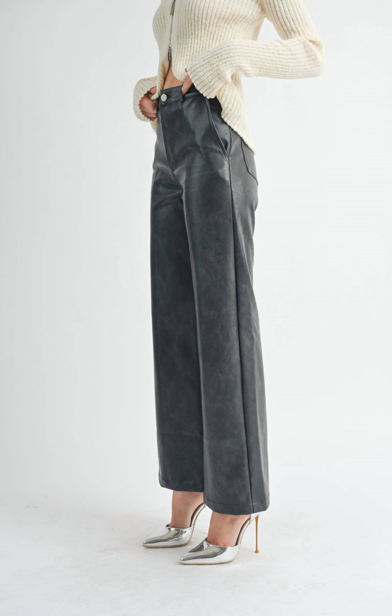 Introducing the Rebel Seamed Vegan Leather Pants by SAGE THE LABEL, a daring addition to your wardrobe. These wide-leg pants come in a bold black hue, crafted from solid faux leather for an adventurous and edgy look. Featuring functional pockets and a secure button closure, they perfectly capture the minimalist trend. Ideal for fall occasions like holiday parties, these pants will make a statement wherever you go.