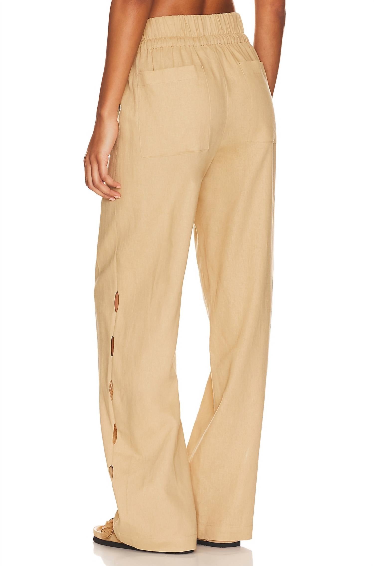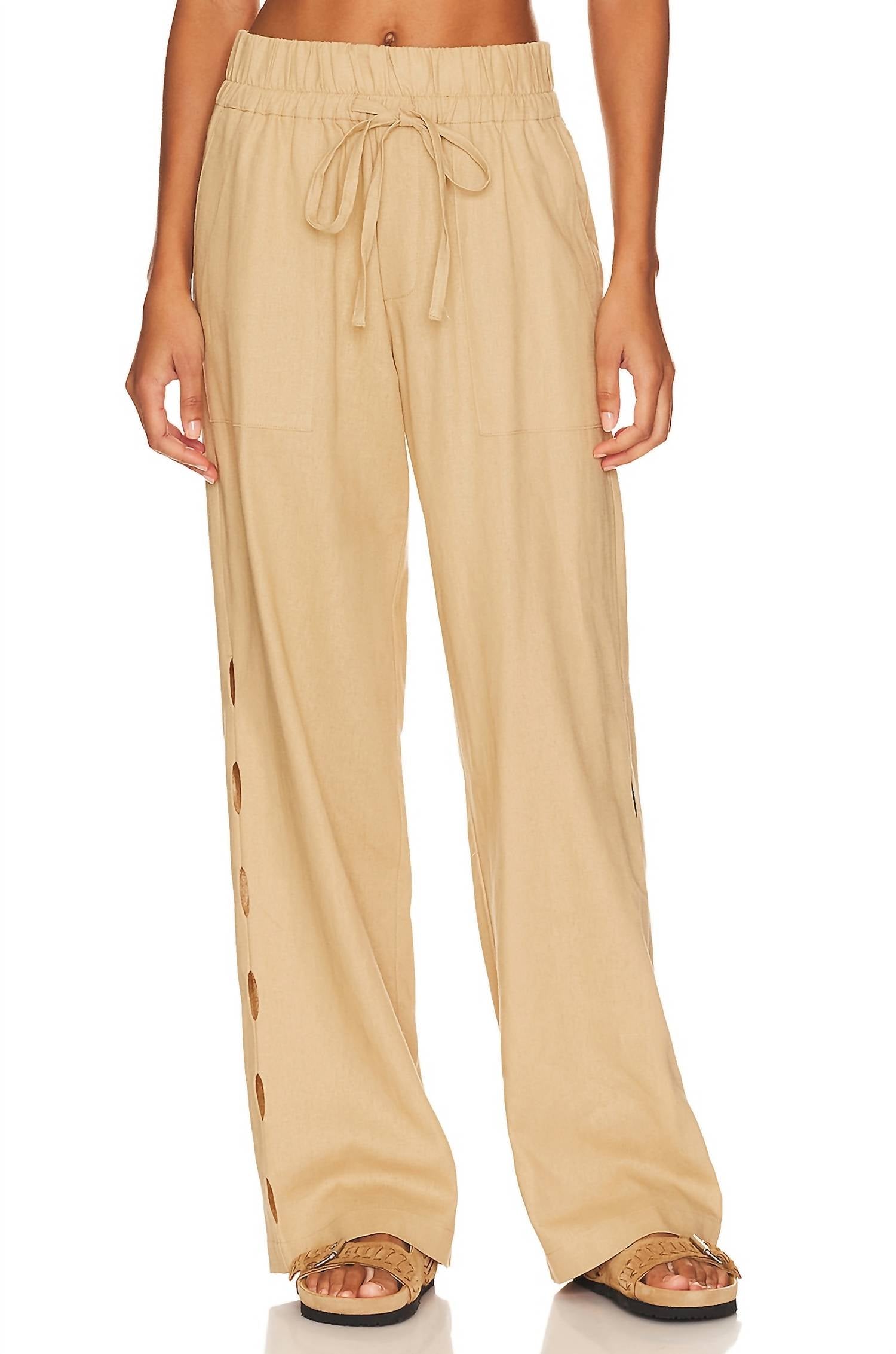 Elevate your spring wardrobe with the Stella Pants by Sanctuary, expertly crafted from a breathable blend of 58% linen and 42% rayon in a versatile khaki hue. Designed in China, these pants feature a comfort fit with a wide leg style, enhanced by an elastic waistband and drawstring closure. The four-pocket design adds functionality, while the ventilated fabric ensures comfort. Care for these minimalist pants with a simple machine wash, making them perfect for holiday parties and Thanksgiving gatherings.