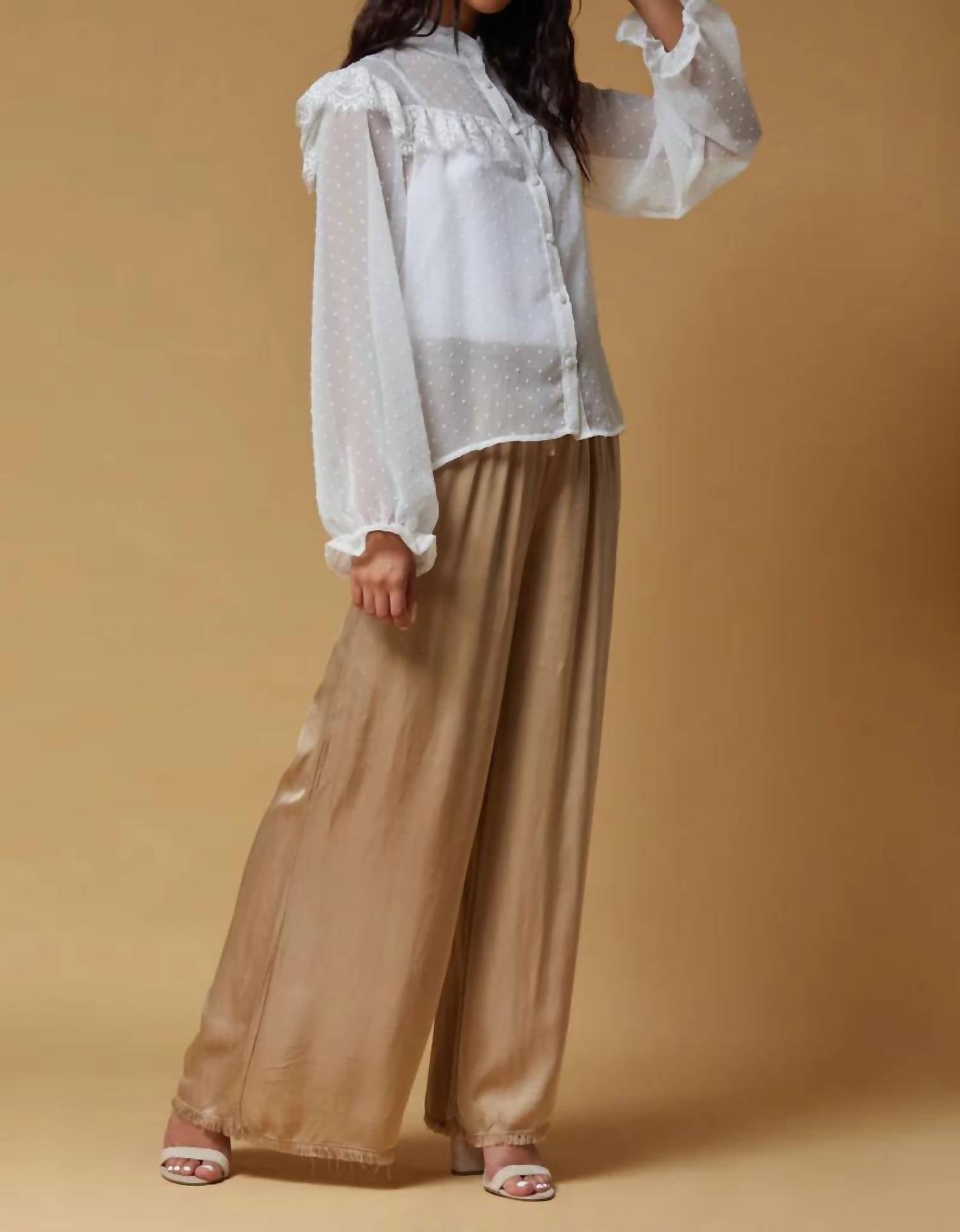 Discover the Lola Pants by Scandal Italy, a luxurious choice for the modern woman's wardrobe. These high-rise, wide-leg pants in a chic caramel hue feature an elasticated waistband and a fringed raw hem, offering a relaxed fit for ultimate comfort and style. Crafted in Italy from 100% viscose with a viscose-elastic lining, these pants are perfect for easy Sunday afternoons or as sophisticated resort-wear. Experience the ease of pull-on closure with convenient pocket storage, embodying a minimalist trend ideal for spring housewarming occasions.