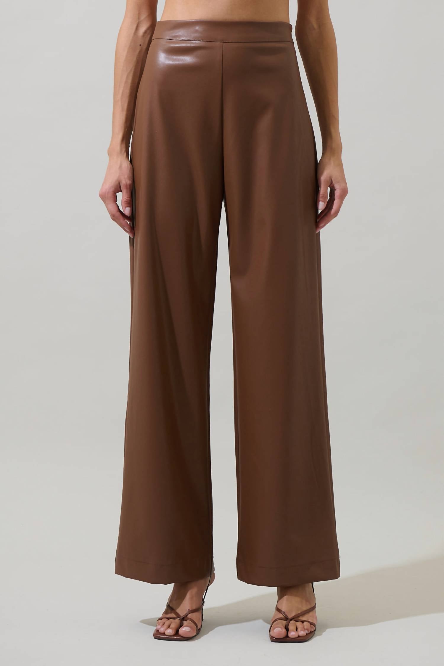 Elevate your fall wardrobe with the Anisa Leather Bern Wide Leg Pants by Sugarlips, designed to make a statement in chic brown. These high-rise pants feature a relaxed fit, wide-leg style, and are crafted from luxurious faux leather. They come with pockets and a pull-on closure, while the 31-inch inseam adds to the elongating effect. Perfect for a vacation or minimalist occasions, these pants are imported and offer unparalleled style and ease.