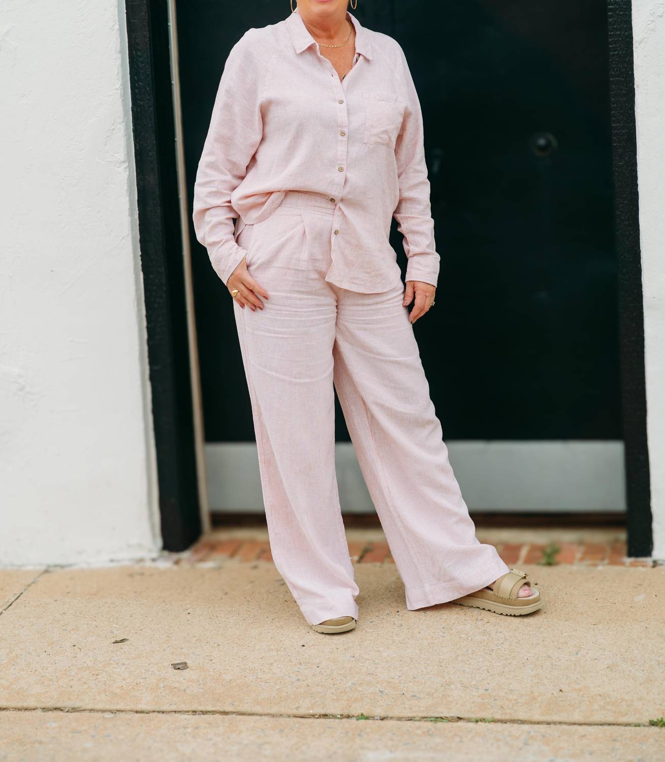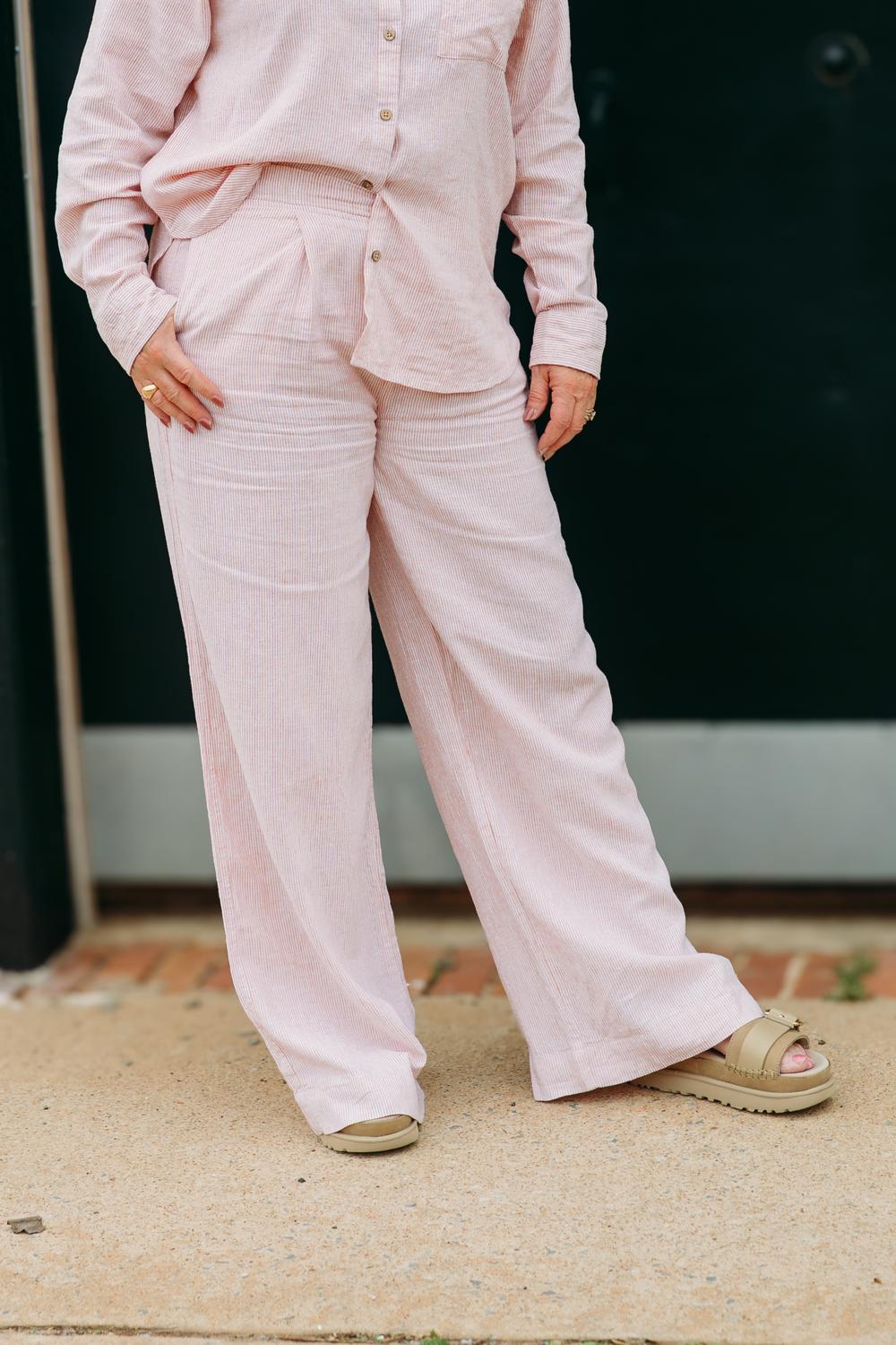 Introducing the Anastasia Pants by Thread & Supply, a chic addition to any wardrobe in a stylish White Clay hue. Designed with an elastic waistband and dual side pockets, these wide-leg pants offer both comfort and practicality. With a composition of 55% Linen and 45% Rayon, they feature a rise of 11.5", a waist of 14", and an inseam of 30.5". Perfect for spring occasions, these pants can be worn solo or paired with the Anastasia Top for a complete, breezy look.