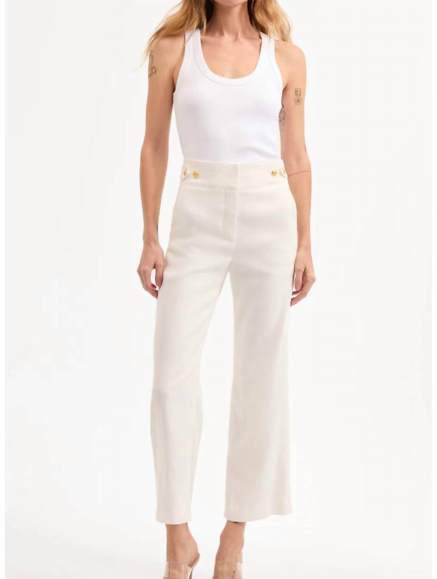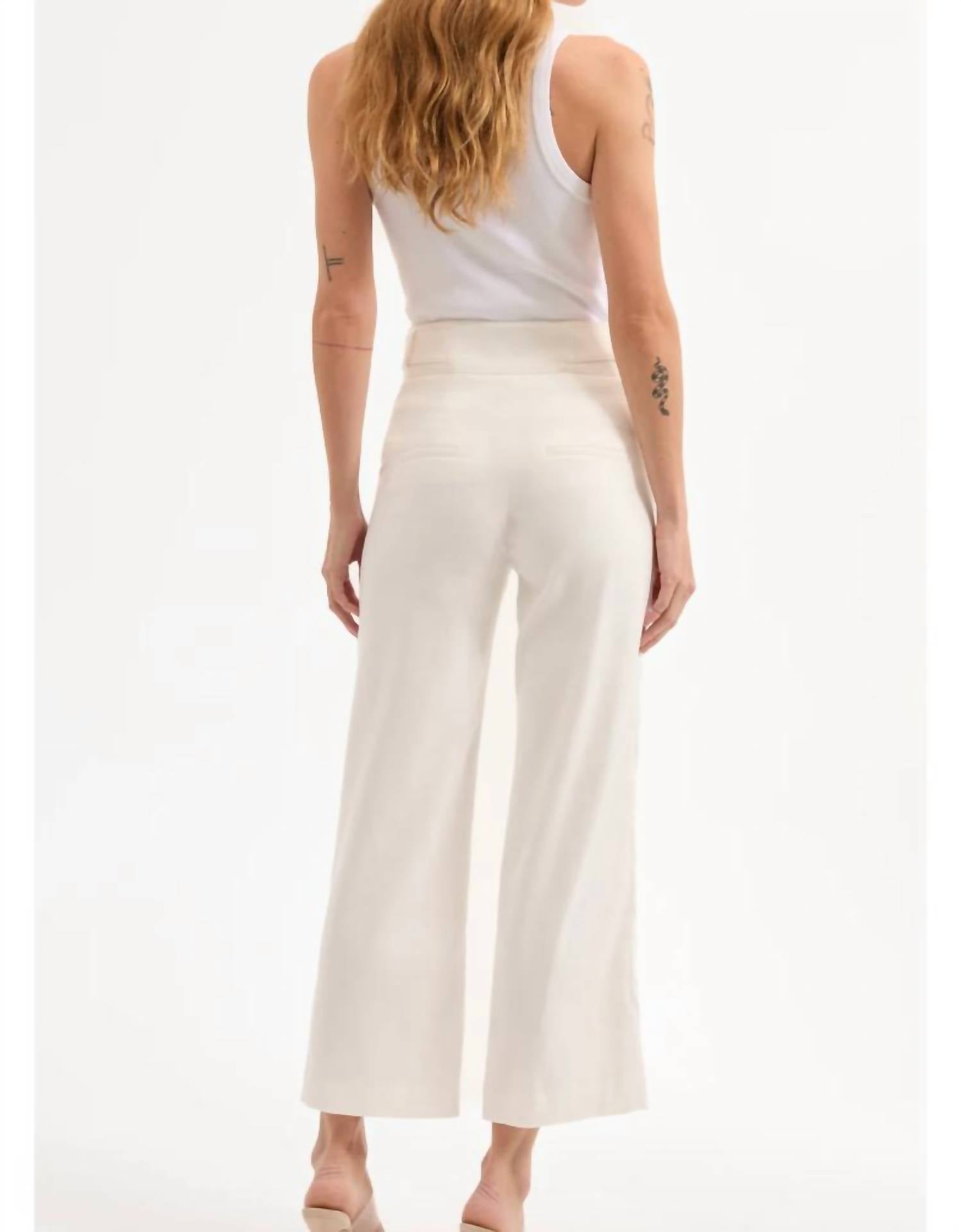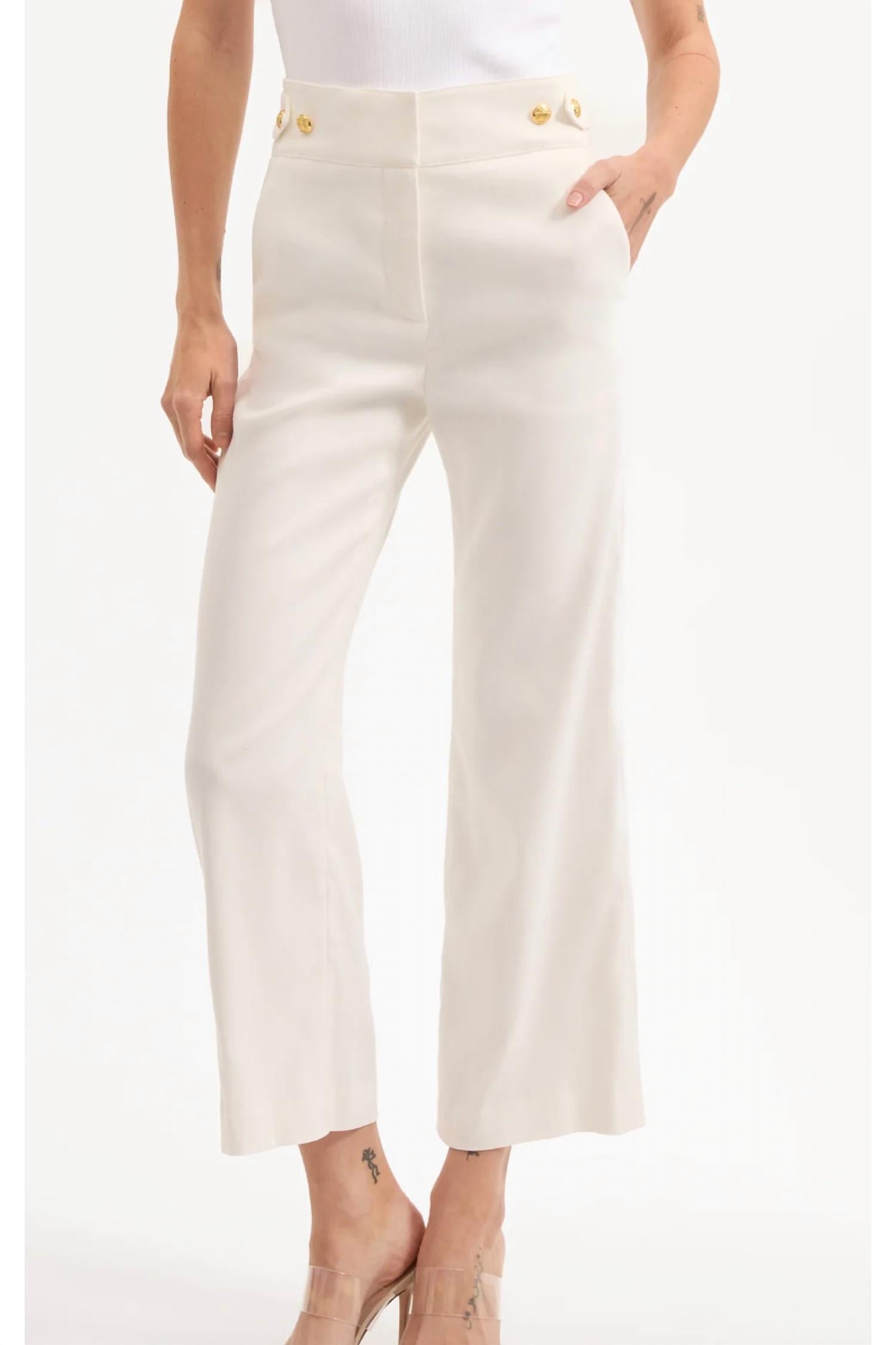 Introducing the Aubrie Pant by Veronica Beard, a chic and comfortable addition to your wardrobe, ideal for the office or any sophisticated outing. These stylish, cropped wide-leg pants in crisp white are crafted from a breathable linen blend composed of 58% Linen, 27% Polyester, 14% Viscose, and 1% Elastane, offering a tailored fit with a hint of stretch. Made in the USA, they feature a convenient zip closure and handy pockets for practicality. Please ensure professional dry cleaning to maintain their refined elegance.