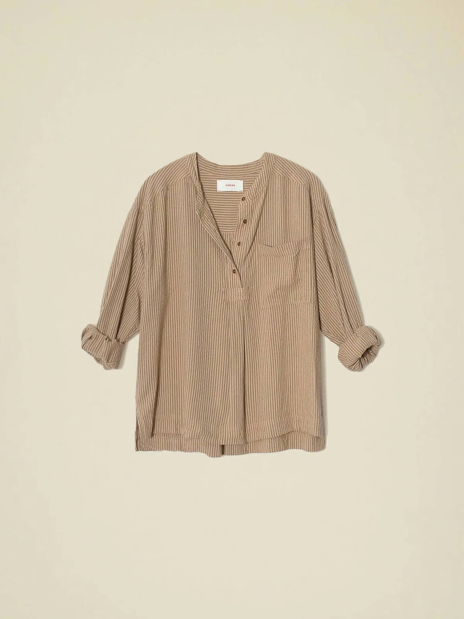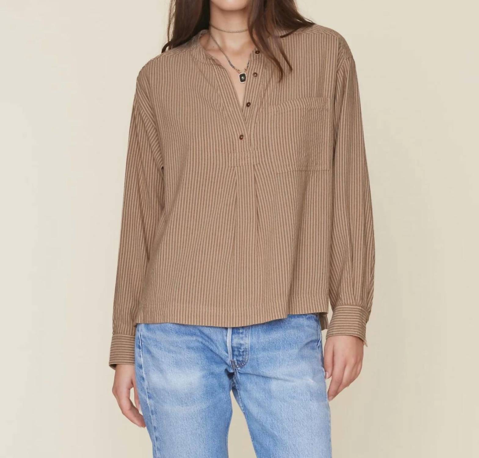 Pair this with your favorite jeans and slides for your next girls night out. Discover the Makenzie Shirt by XIRENA, a preppy blend of style and comfort in Fawn Stripe. This long sleeve blouse is made from a luxurious viscose blend, composed of 62% Viscose, 30% Cotton, 7% Polyester, and 1% Paper Yarn, offering a soft and textured tonal stripe. Designed with practicality in mind, it features a V-neckline, a left chest pocket, and pearlized snap closure, all crafted in Los Angeles. For care, machine wash cold and lay flat to dry, or opt for dry cleaning. Model is 5'9.5" and wears a size small.