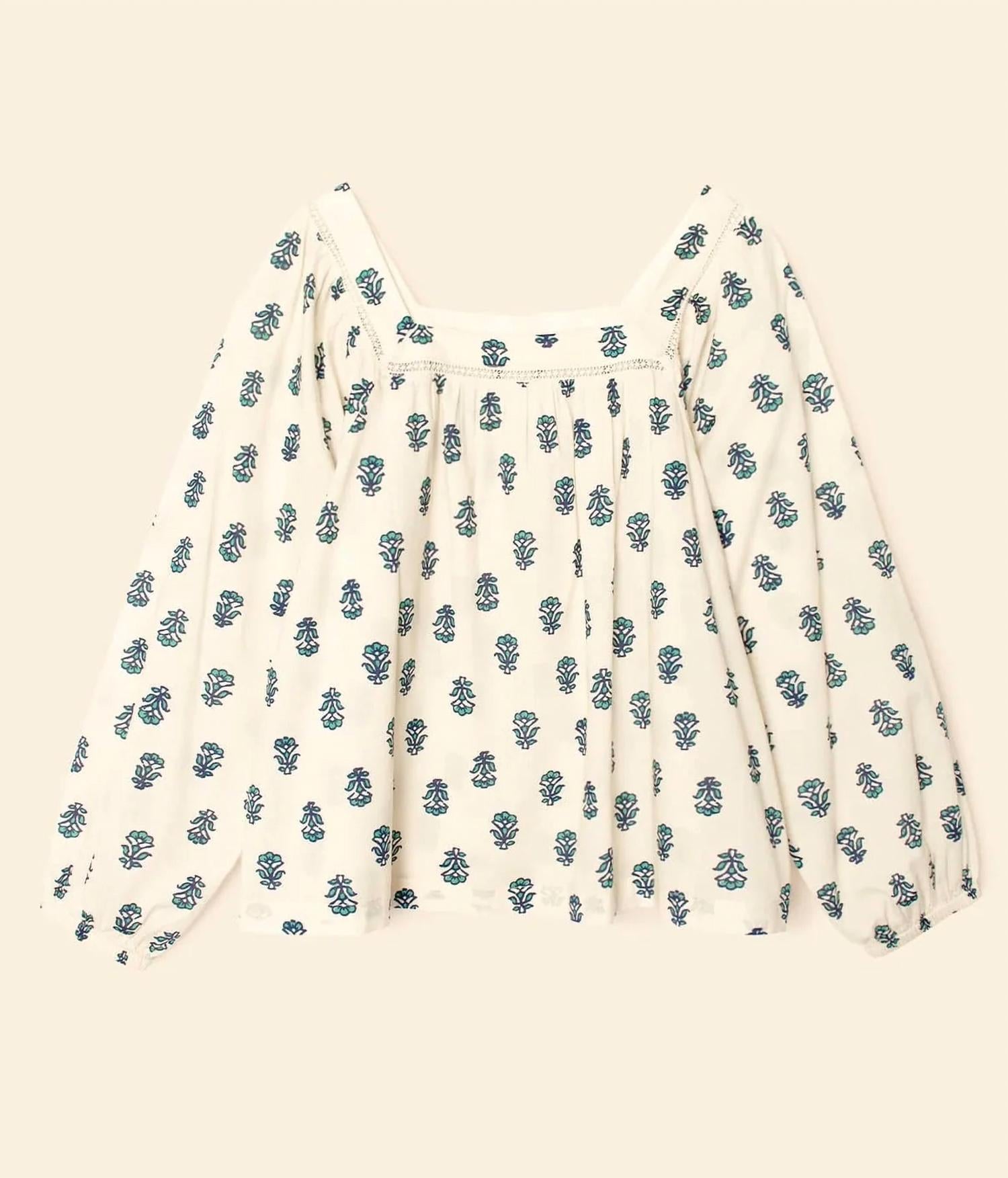 Pair this with your favorite jeans and slides for your next girls night out. Introducing the Mira Cotton Top by XIRENA, an ideal addition to your summer wardrobe. Crafted in the U.S. from 100% lightweight cotton in a charming clover stamp pattern, this blouse features long blouson sleeves and a shirred square neckline accented with delicate lattice trim. The pull-on style provides ease and comfort, making it perfect for vacation and maximalist trends. Enjoy effortless maintenance with machine wash cold and gentle tumble dry care instructions, while a true-to-size fit ensures comfort for a variety of occasions. Model is 5'10" and wears size Small.