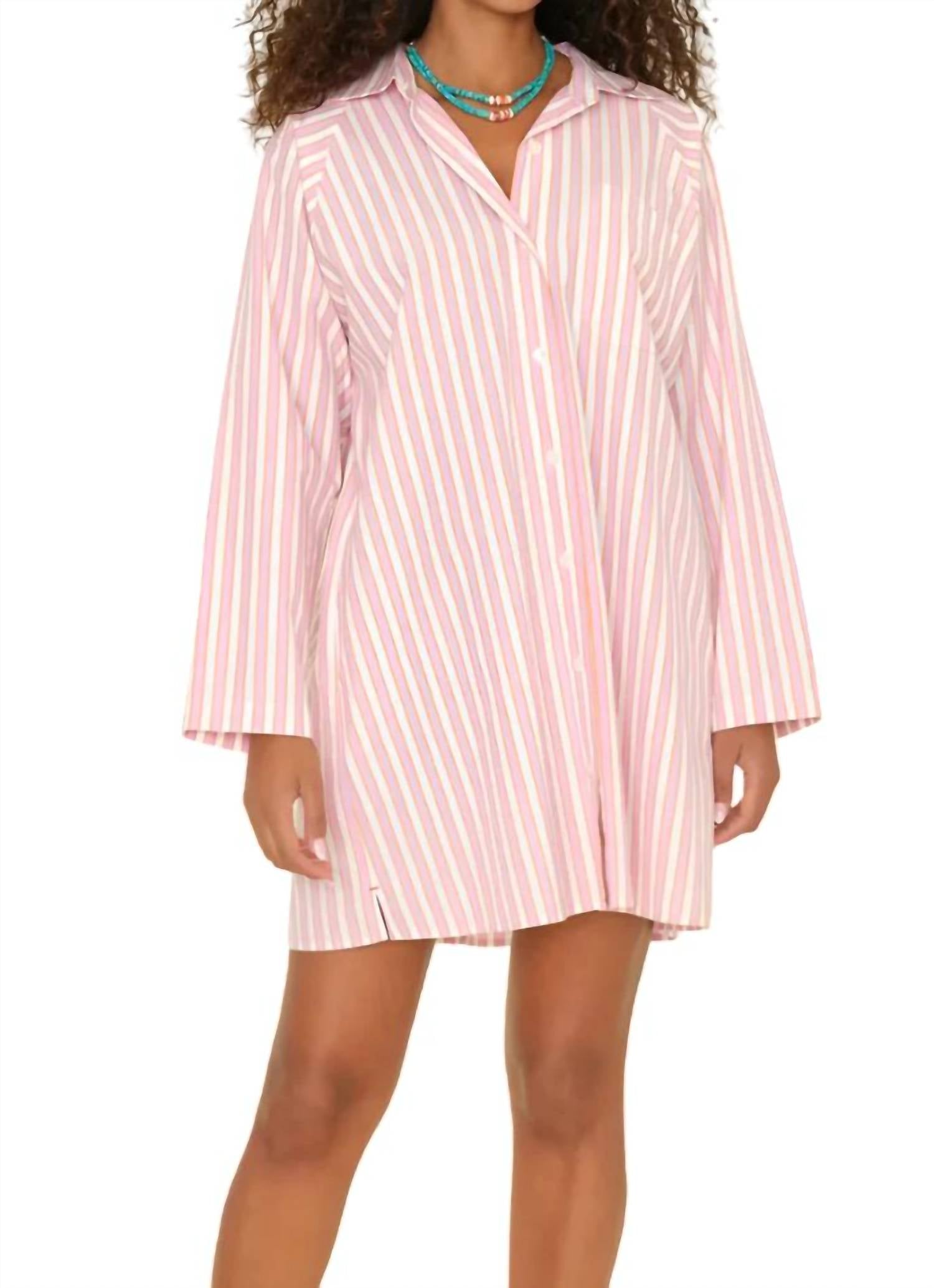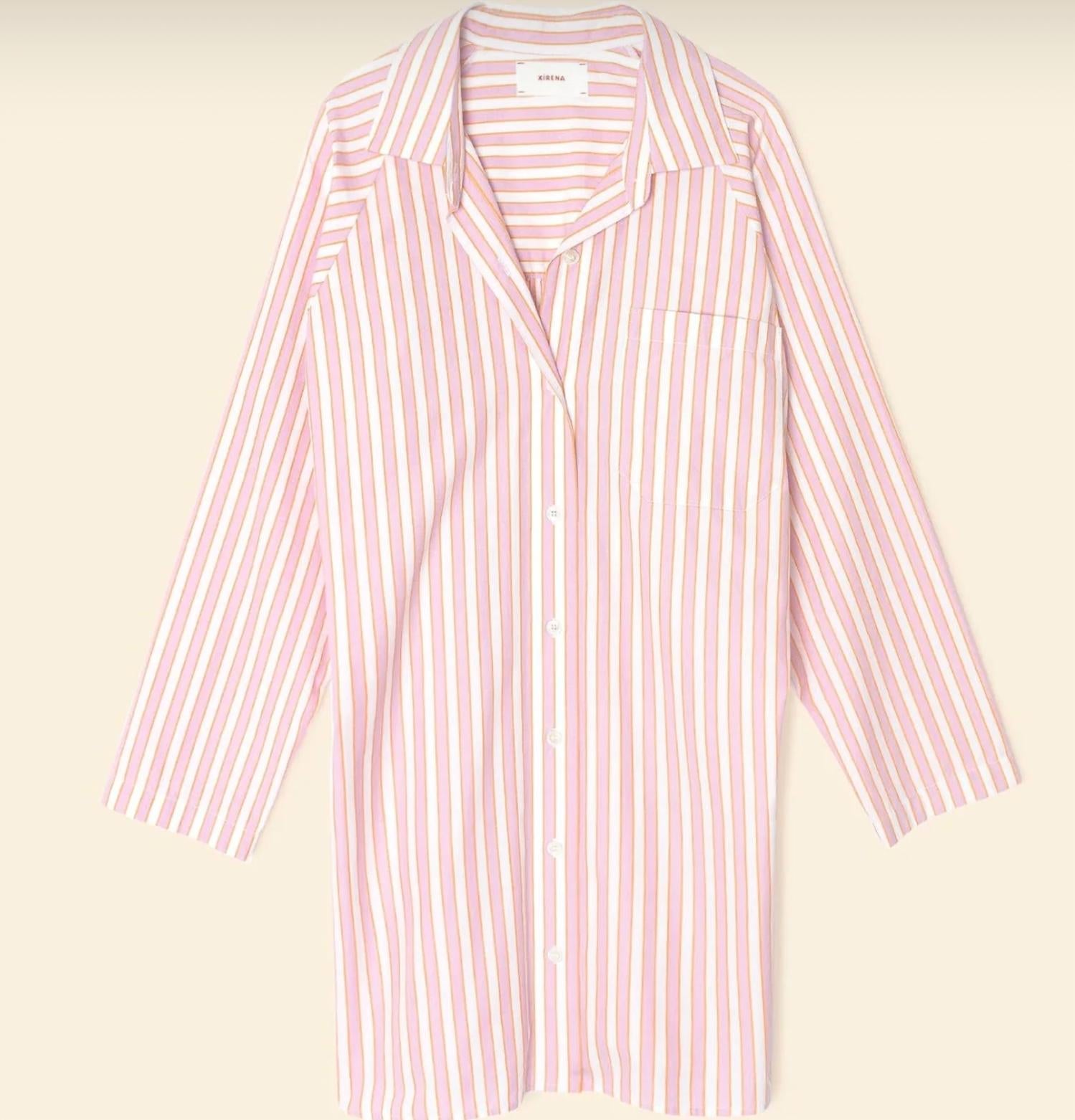 The kind of easy and flattering dress you'll be reaching for all season long. Introducing the Women's Flora Cotton Poplin Shirt Dress by XIRENA, a Spring essential in vibrant Pink Sorbet stripes. This long sleeve mini features a collar neckline and offers a relaxed fit with a button-front closure. Made from 100% cotton, it boasts a practical left chest pocket and side seam pockets. Crafted in Los Angeles, this versatile piece transitions effortlessly from streetwear to vacation mode.