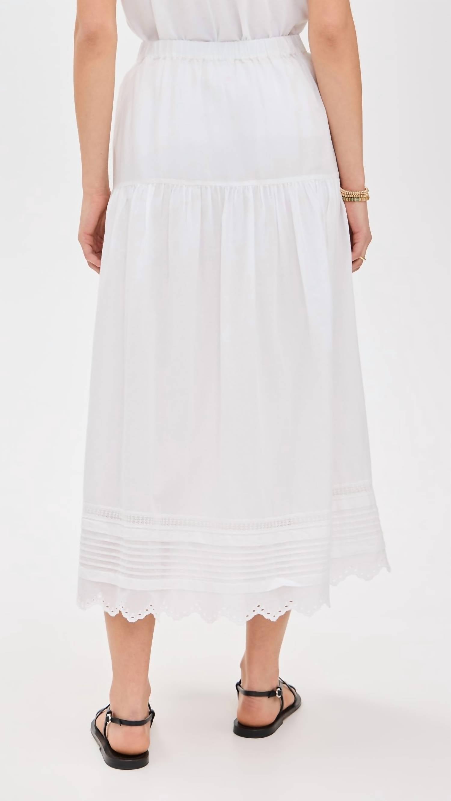 Tuck in your favorite tee for a more casual yet feminine look. Introducing the Tilda Skirt by XIRENA, an elegant piece that effortlessly combines comfort and style. This white, midi-length skirt is crafted from superfine cotton voile and features a flattering A-line silhouette with a tiered, scalloped eyelet hem. It includes on-seam side pockets and a partial elastic waistband for a comfortable pull-on closure. The skirt is made with 100% cotton from India and is machine washable for easy care.