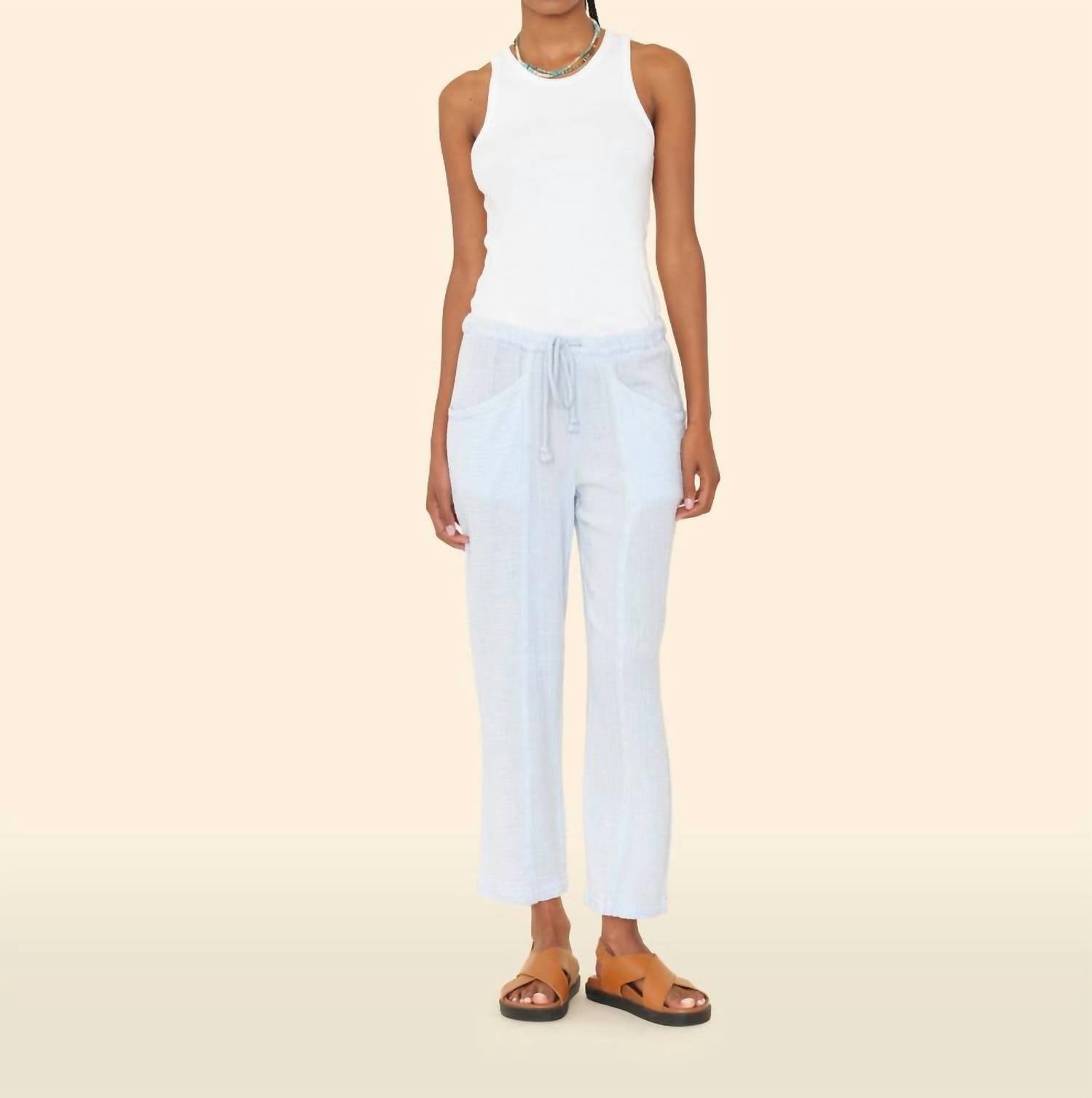 A perfectly tailored straight leg that you'll want in every color! Introducing the XIRENA Ozzie Ankle Pant in Blue Mist, perfect for your spring workwear wardrobe. These cropped pants are crafted from 100% cotton Chelsea Gauze, featuring an elasticized drawstring waist for easy pull-on comfort. Designed with slant pockets and a center-front seam, they offer a clean, polished look. Made in Los Angeles, the pants ensure quality and style, with a 26.5-inch inseam for a flattering silhouette. Care: Machine wash cold, gentle cycle, lay flat to dry.
