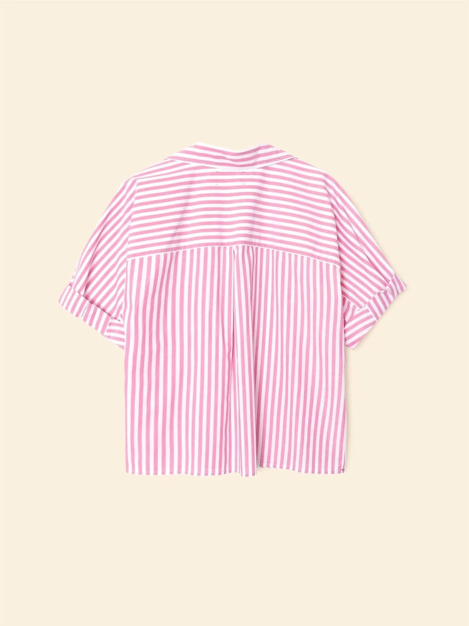 This button down shirt is comfortable yet polished. Meet the Teddy Shirt by XIRENA, a must-have for your summer vacation wardrobe. This short sleeve shirt, featuring a crisp cotton stripe in Rosebud, offers an easy, cropped and boxy fit with a classic collar. The button-front closure adds a minimalist touch to this stylish women's button-down. Ideal for a laid-back summer look.
