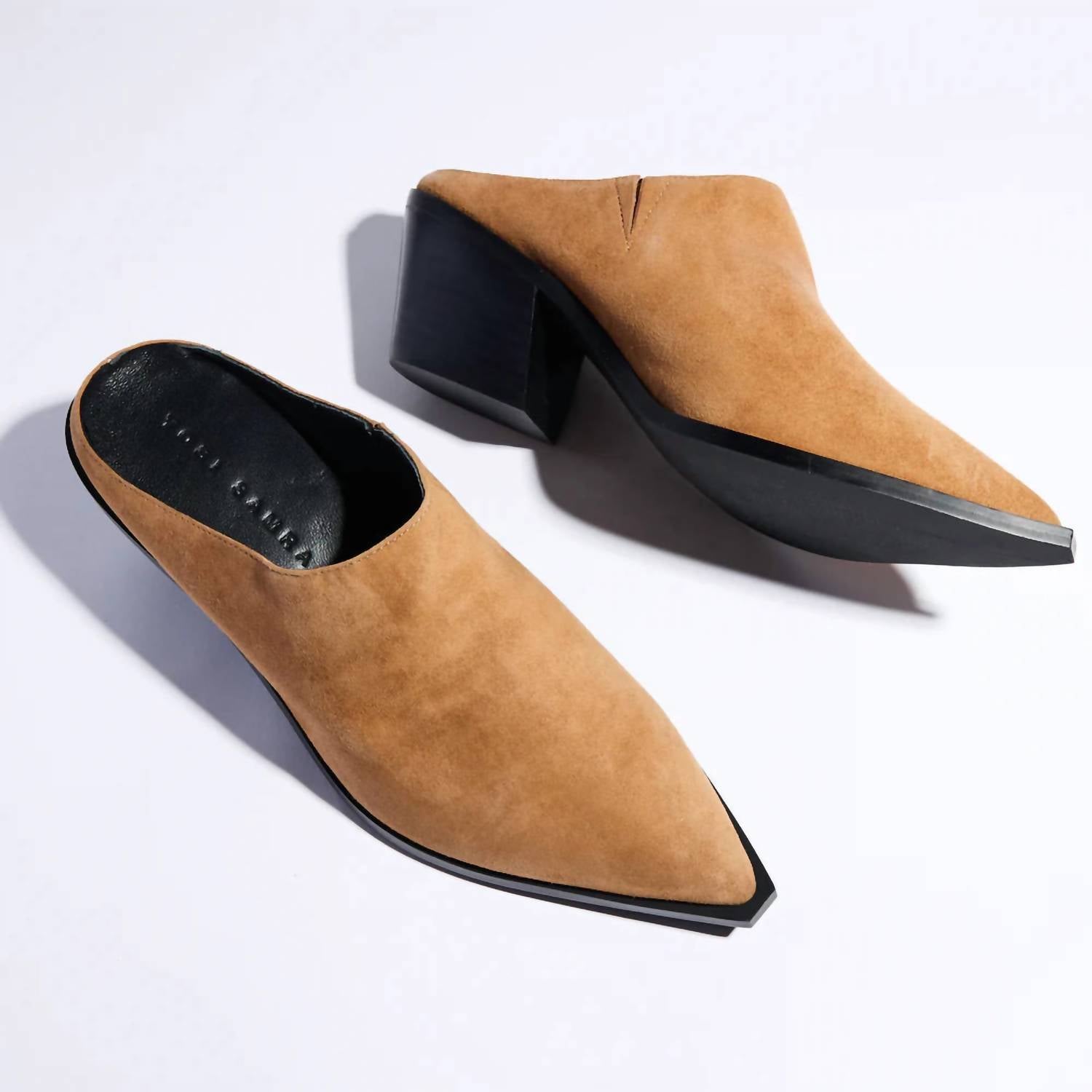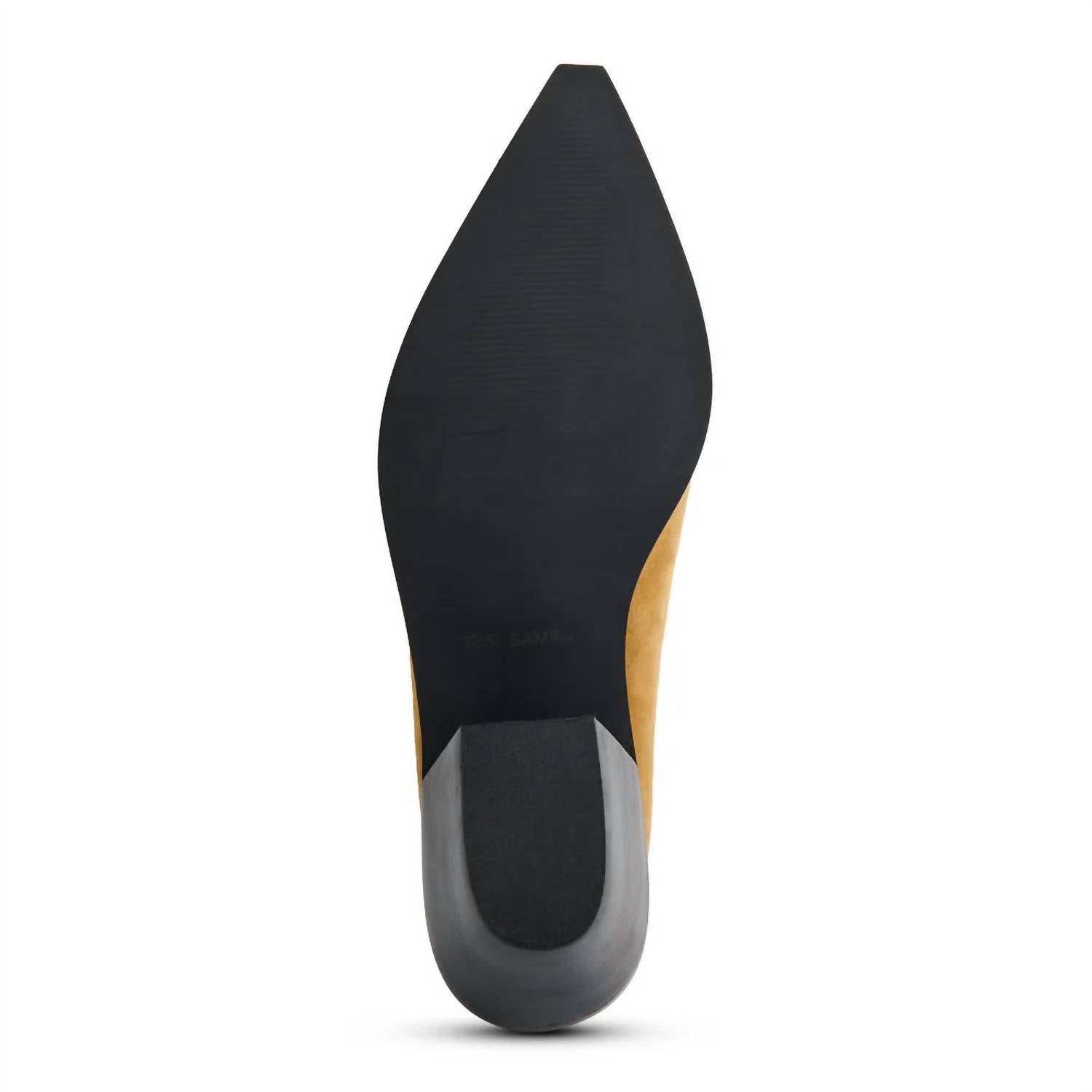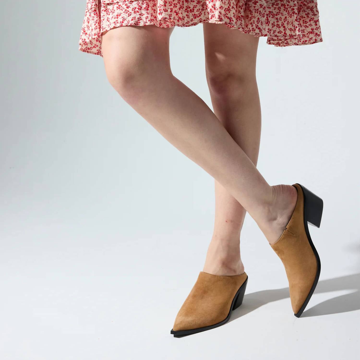 Slip them on and go! Introducing the Women's Savile Pointed Toe Mules by YOSI SAMRA, crafted in rich Whiskey Suede for a minimalist holiday party look. These modern mules feature a sharp pointed toe and stylish block heel, effortlessly blending edge and elegance. Designed for easy slip-on wear, they are the perfect addition to both tailored outfits and casual denim. Ideal for Thanksgiving gatherings, these mules are a versatile choice for the spring season.
