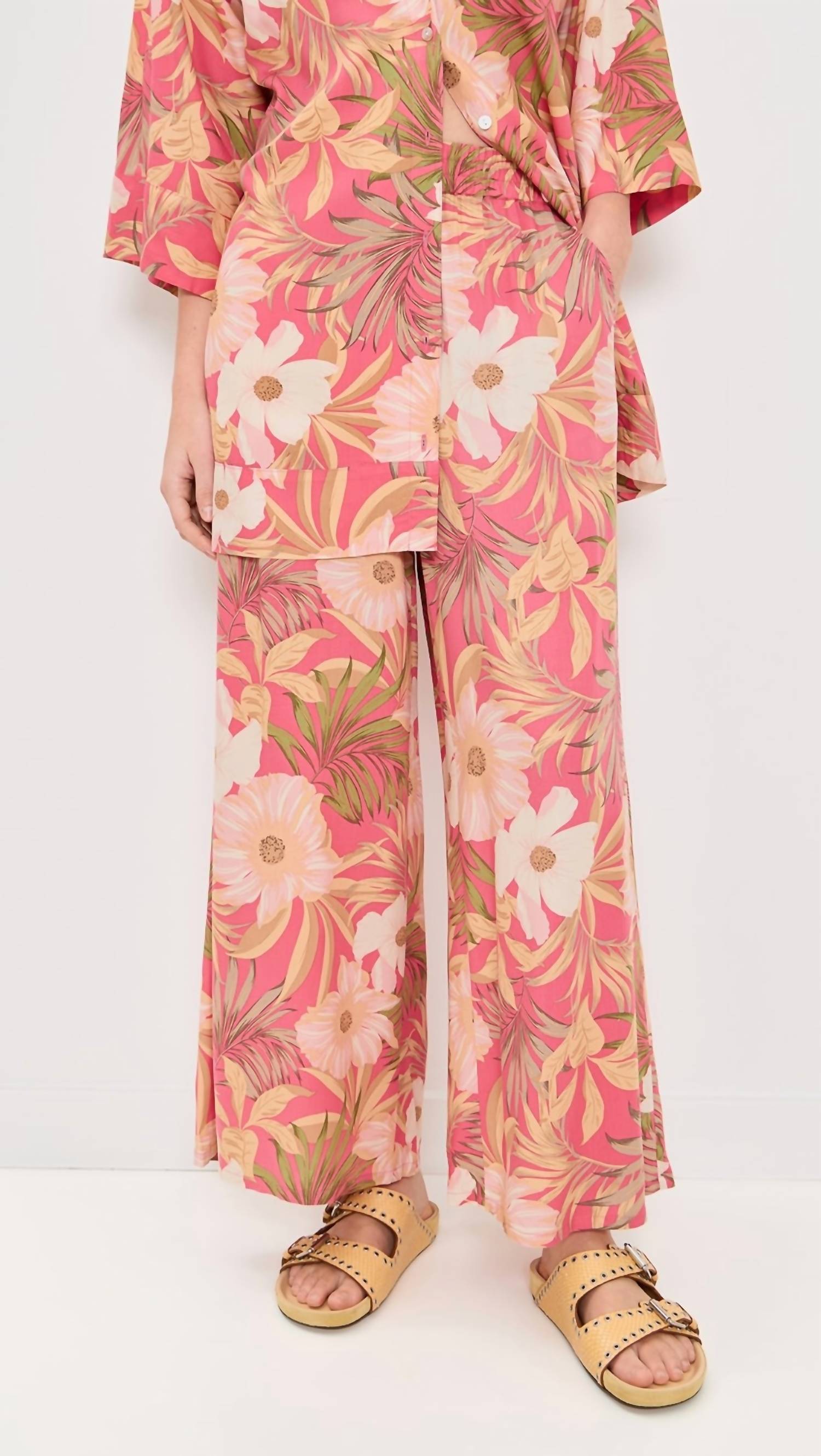 Introducing the Z Supply Dante Barra Tropic Pants in Sunset Pink, perfect for adding a fresh touch to your spring wardrobe. These wide-leg pants feature a relaxed fit and a floral pattern, designed with a high-rise pull-on elastic waistband for ultimate comfort. Made from 100% lightweight, non-stretch rayon, they include slant hip pockets and are imported from China. With dimensions of a 10.75-inch rise, 26.75-inch inseam, and a 29.25-inch leg opening, they offer a breezy boho chic style suitable for vacation wear. Care: Hand wash cold separately and lay flat to dry, or dry clean.