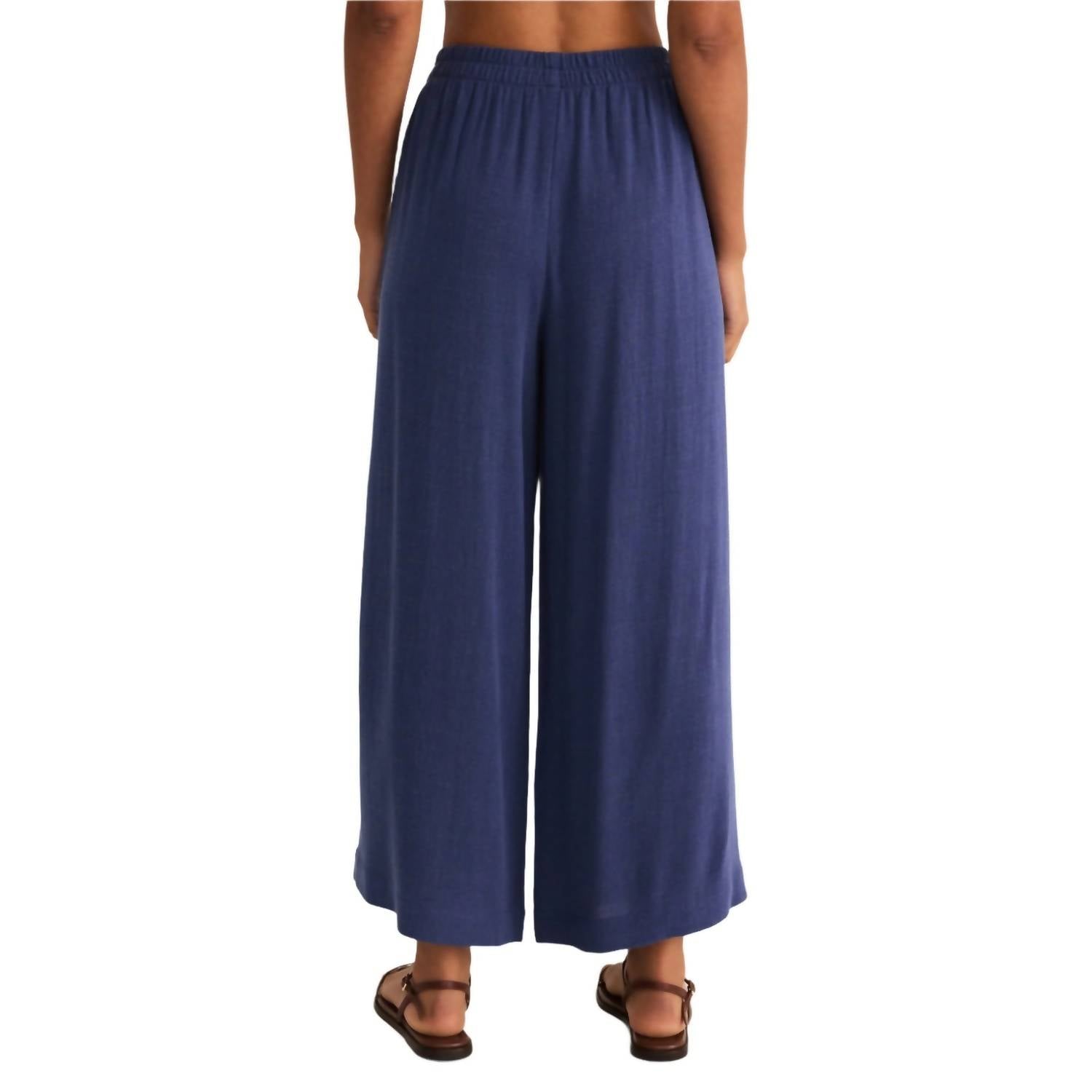 Discover the Scout Linen Rayon Pant by Z Supply, a must-have for a relaxed beach look or casual lounging. These women's pants in solid blue feature a high-rise waist with a pull-on closure, ensuring ease and comfort. Composed of 86% rayon and 14% linen, the wide legged, cropped length design is perfect for summer days. Care instructions: machine wash and lay flat to dry. Dimensions for size XS: 26" inseam, 25.5" waist, 42.75" hip.