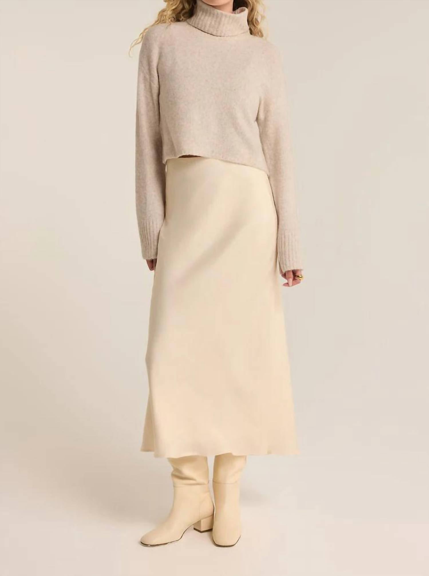 Tuck your favorite tee into this midi length skirt for an effortlessly cool look. Meet the Europa Poly Sheen Skirt by Z Supply, a luxurious midi-length skirt in an elegant Sea Salt hue. With its 100% Polyester Luxe Sheen material, this skirt is fully lined and crafted on the bias for a flowy fit. Featuring a mid-rise elastic waistband, it offers effortless style with a pull-on closure. Care instructions include hand wash cold separately and line dry or dry clean.