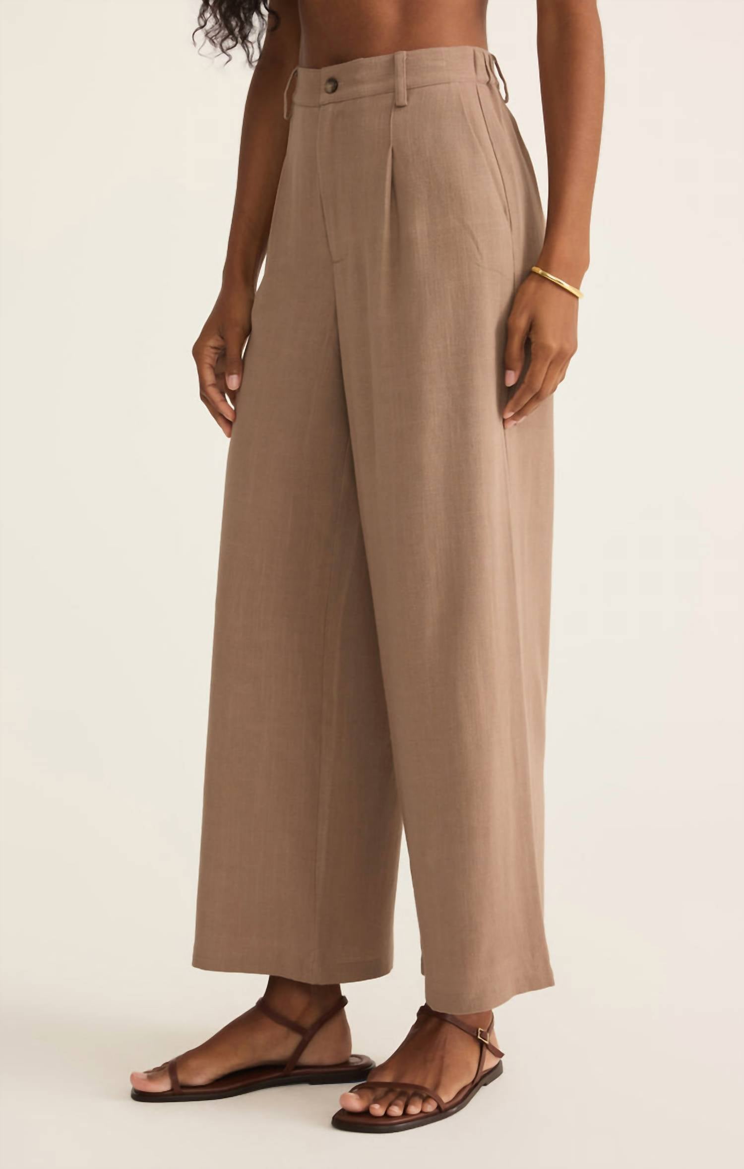 Upgrade your wardrobe with these cropped pants, designed to merge sophistication and wearability. The tailored fit ensures ultimate comfort during long days or nights out. Introduce your wardrobe to the Vista Pants in Iced Coffee from Z Supply, perfectly crafted for both lounging and running errands. These ankle-length pants feature a regular fit with a wide leg style, made from an 80% Viscose and 20% Linen blend. With a mid-rise fit, they include practical side seam pockets and a convenient zip fly with button closure, offering both style and functionality. Easily maintain their plush texture with machine wash on a gentle cycle and hang dry, making them an ideal choice for day-to-night transitions.