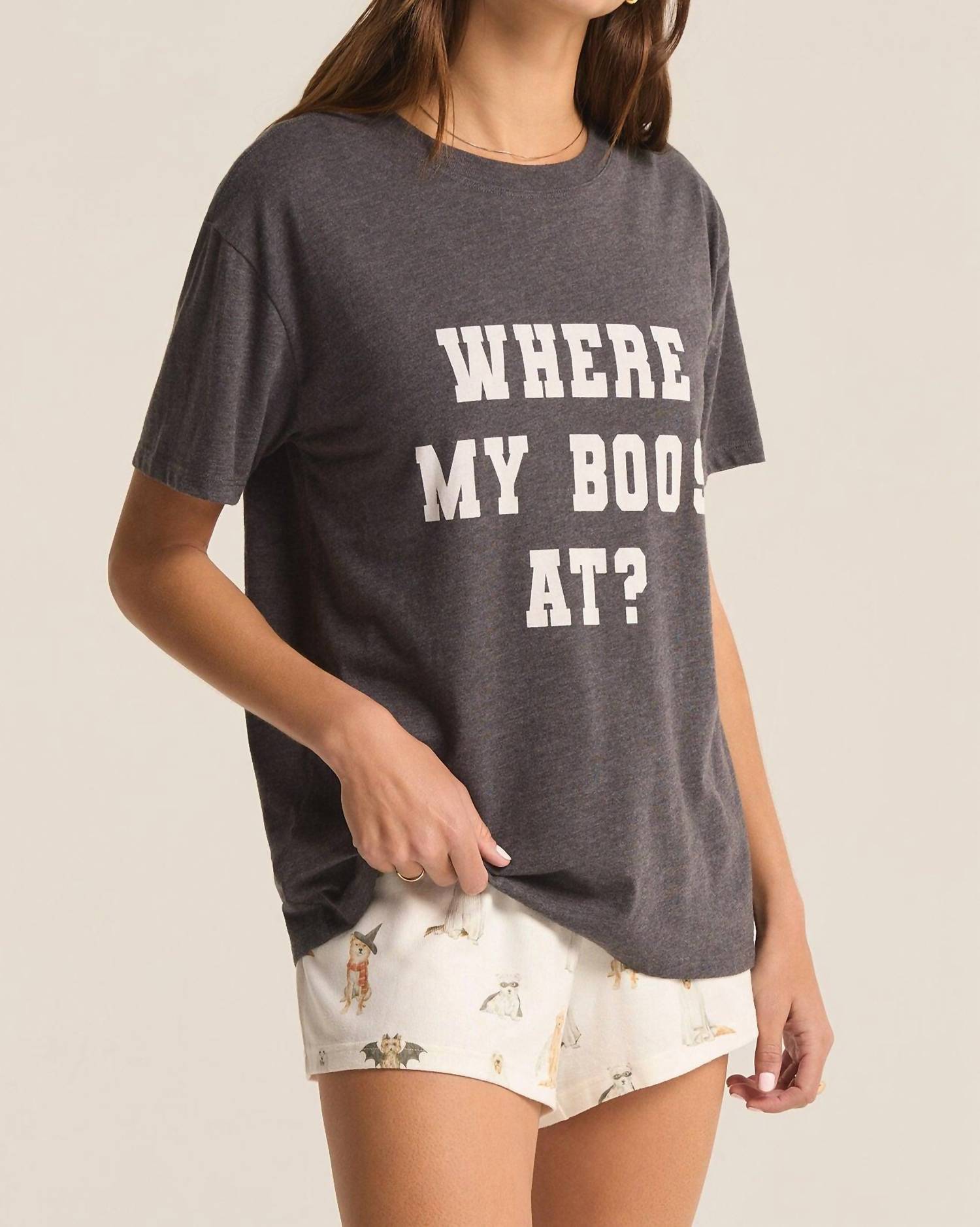 Elevate your casual wardrobe with the My Boos Boyfriend Top by Z Supply, designed in a trendy charcoal heather hue. This short sleeve tee boasts a graphic detail on the front and features an oversized fit. Crafted from a soft cotton blend, 60% cotton and 40% polyester, this top offers a comfortable wear experience with a convenient pull-on style. Length measures 25 1/4" from the shoulder, making it an essential piece for a laid-back, effortlessly chic look.