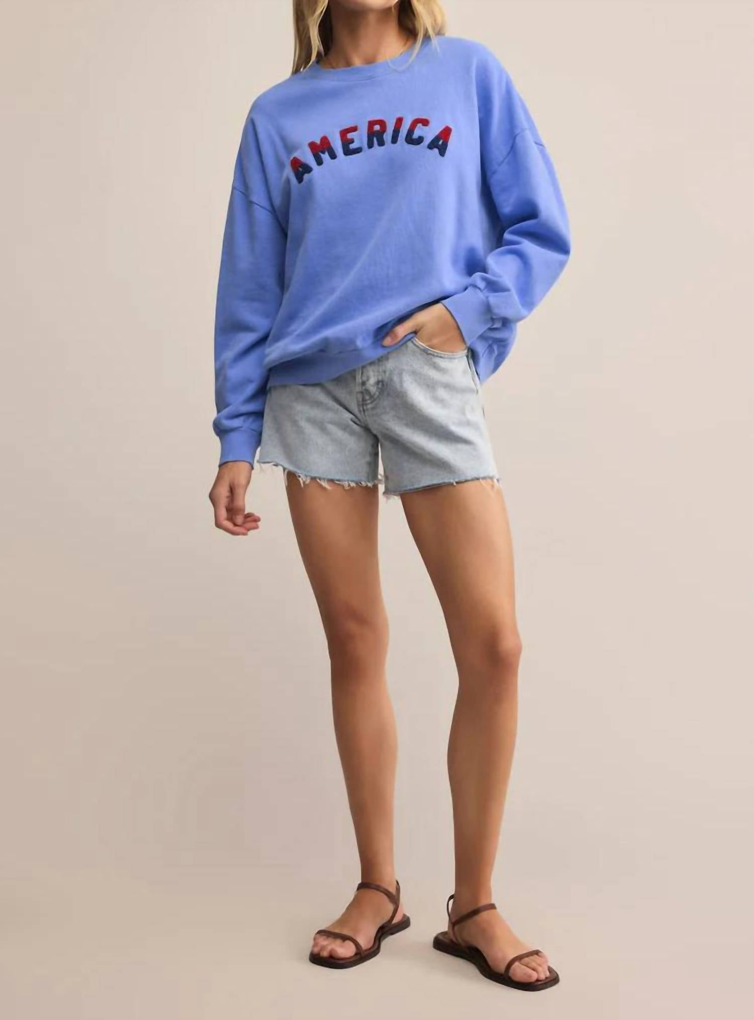 Experience the perfect blend of comfort and style with this trendy crew neck sweater, designed to effortlessly elevate your wardrobe. Pair it with your favorite denim and loafers for the perfect look. Embrace effortless comfort and style with the Z Supply America Sunday Sweatshirt in Surf Blue. This women’s graphic top features long sleeves and a versatile crewneck, made from 100% cotton brushed fleece for a cozy feel. The oversized fit adds a relaxed vibe, with a pullover design for easy wear. Garment Length from Shoulder: XS 25", S 25.5", M 26", L 26.5". Bust: XS 48", S 50", M 52", L 54.5". Model is 5'8" wearing size S (31" bust, 25" waist, 35.5" hips).
