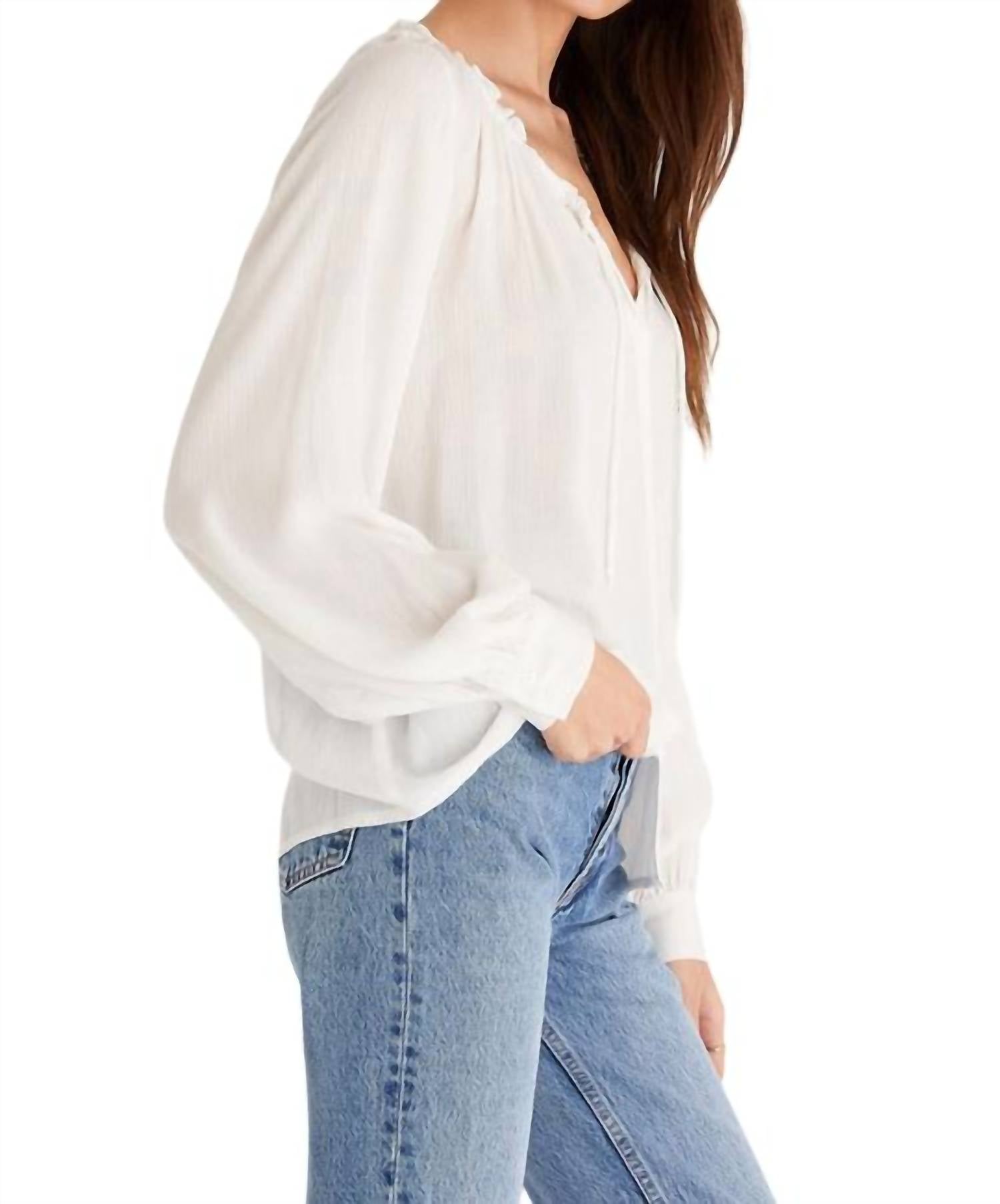 Elevate your wardrobe with the charming Adella Blouse by Z Supply, featuring elegant long sleeves for a timeless look. Crafted from lightweight, semi-sheer crinkle rayon, this top effortlessly transitions from work to weekend. Sleeve Length: Long Sleeve. Material: Rayon. Neckline: V-Neck with fun ruffle details and ties. Closure: Pull on. Care: Hand wash and lay flat to dry. The solid white hue adds a touch of sophistication to this essential peasant-style blouse.