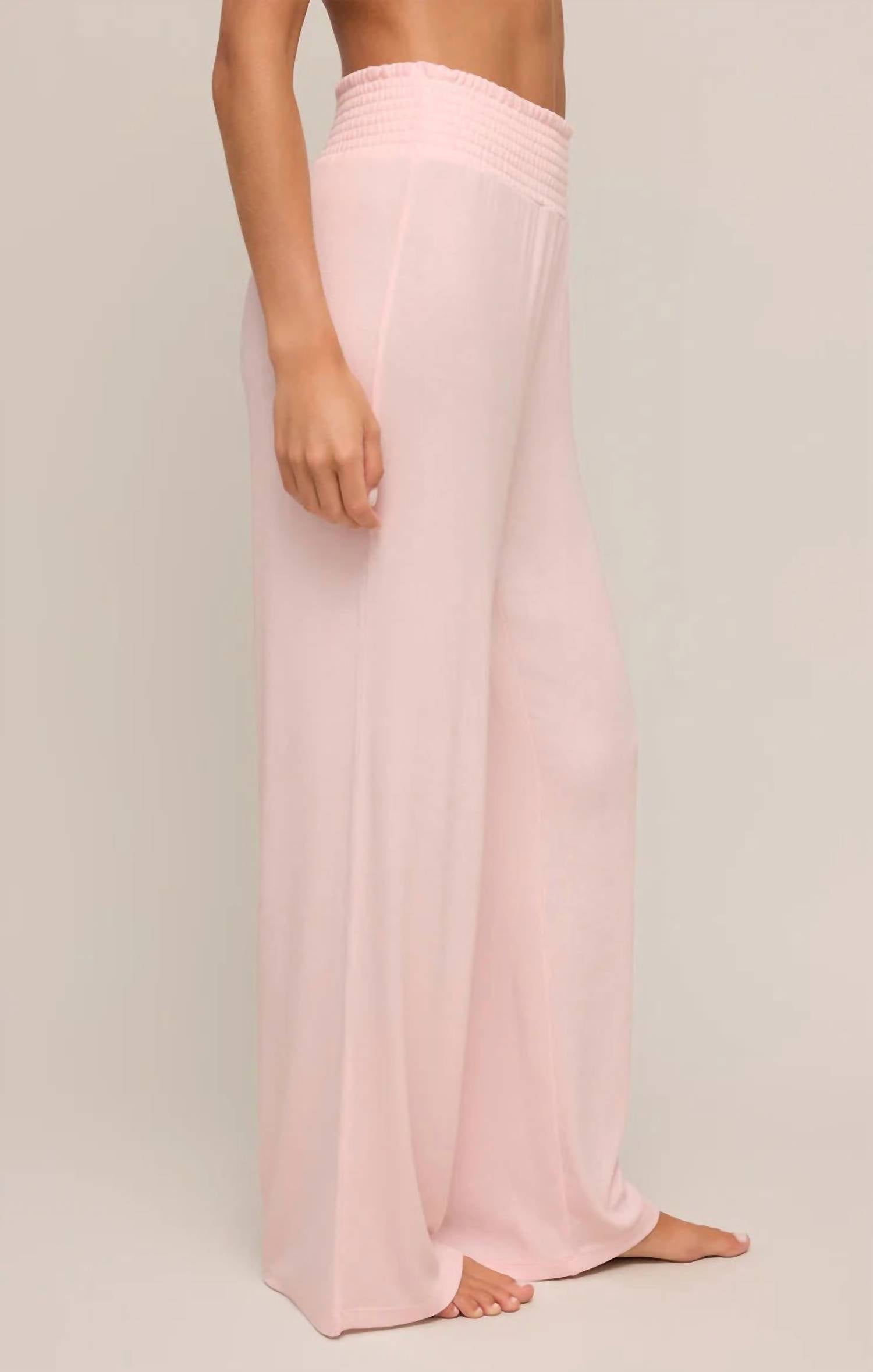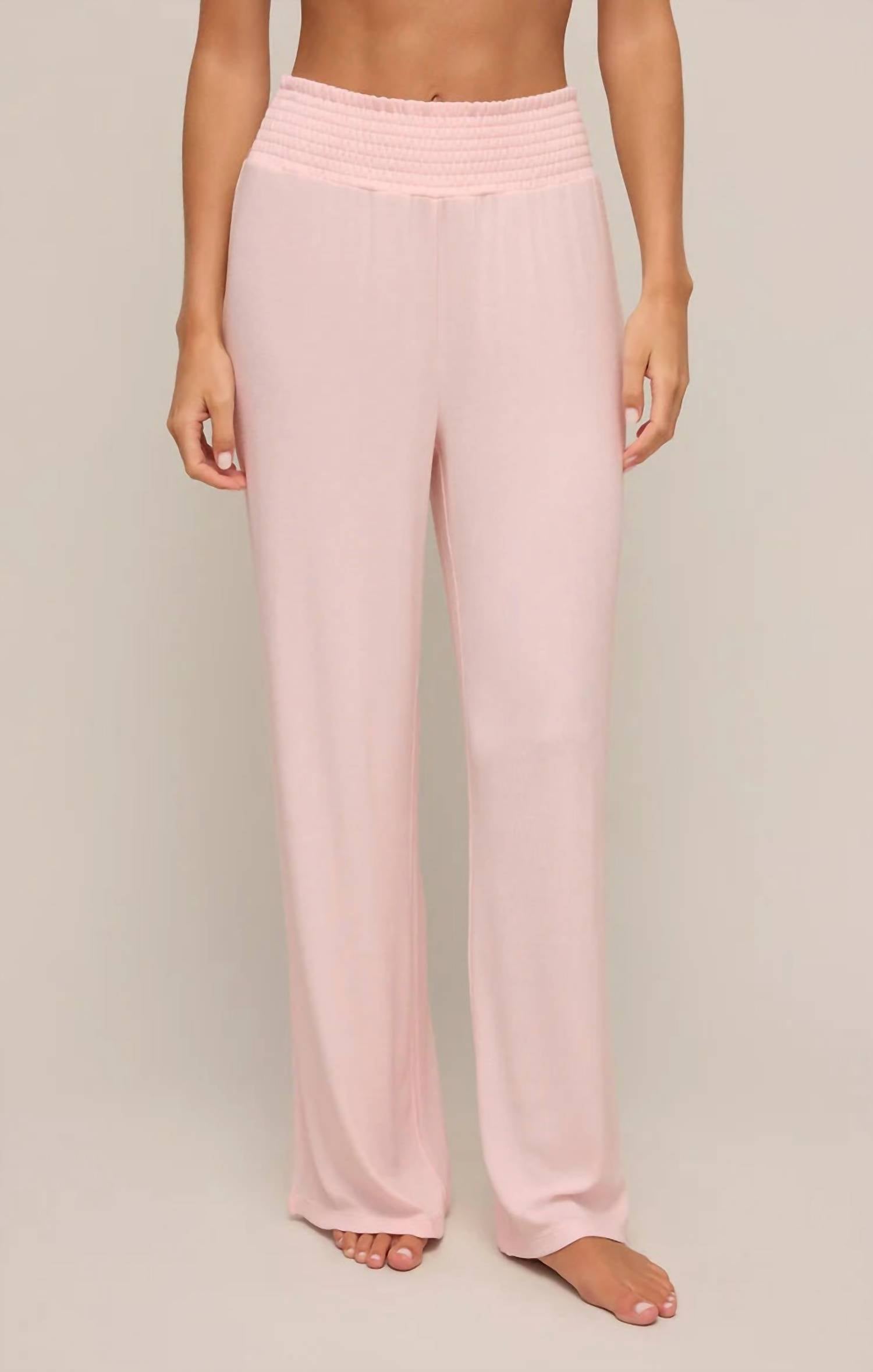 This straightleg pant is both stylish and comfortable. Did we mention the fit is perfection? Discover the Dawn Lux Rib Pant by Z Supply in a delicate Whisper Pink, designed for ultimate laid-back elegance. Crafted from a scrumptious 95% Modal and 5% Spandex rib for a buttery soft touch, this high-rise pant features a full-length, relaxed straight-leg fit with a comfortable smocked waistband. Closure: Pull on. Care instructions include machine washing on a gentle cycle, with options for tumble drying low or laying flat to dry. The model, Hannah, is 5'9" and showcases the size small, offering a true-to-size fit.