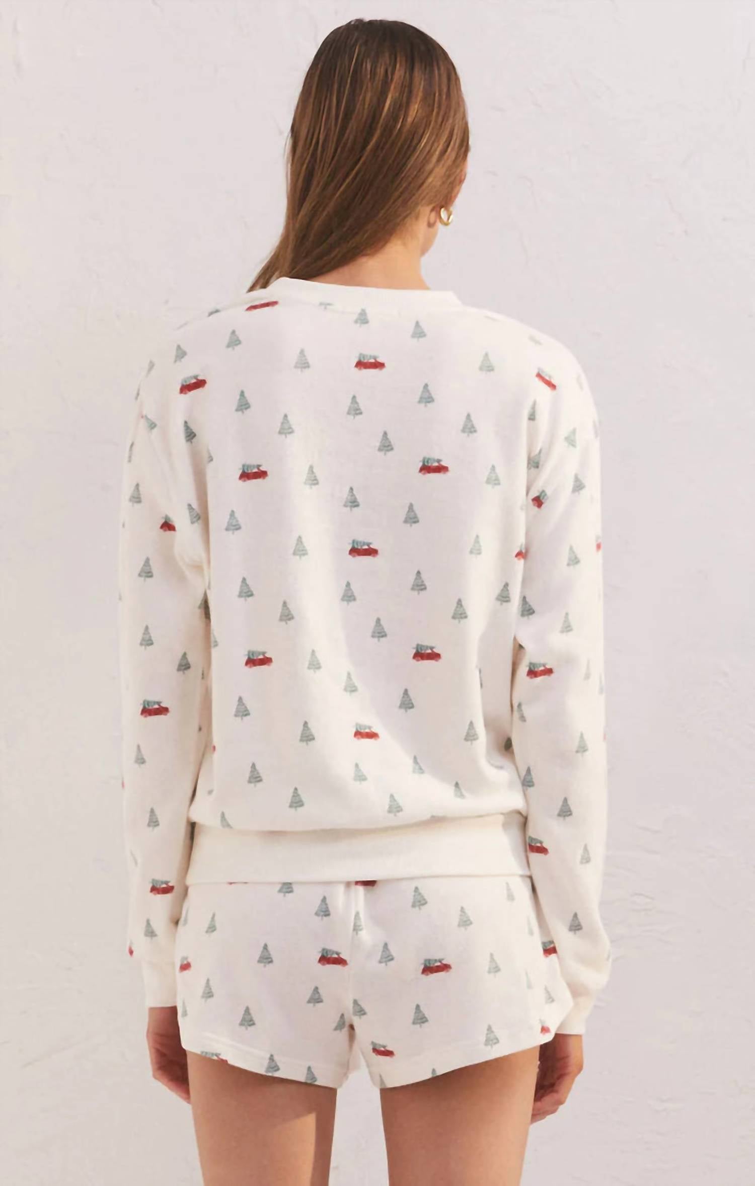 Stay warm and stylish in this versatile and effortlessly cool knitwear staple. Wear it alone or layered, it's the perfect sweater for the season and you'll wish you had it in every color. Celebrate the holidays with the Z Supply Classic Christmas Sweater, featuring festive vintage tree prints on a crisp white backdrop. This women's long sleeve top offers a regular fit in a cozy cotton blend composed of 57% Cotton, 38% Polyester, and 5% Elastane. Designed with a crew neckline, pull-on closure, and solid cuffs and waistband, it ensures comfort and ease. Care: Machine wash cold and tumble dry low, so you'll spend less time on laundry and more time enjoying the festivities.