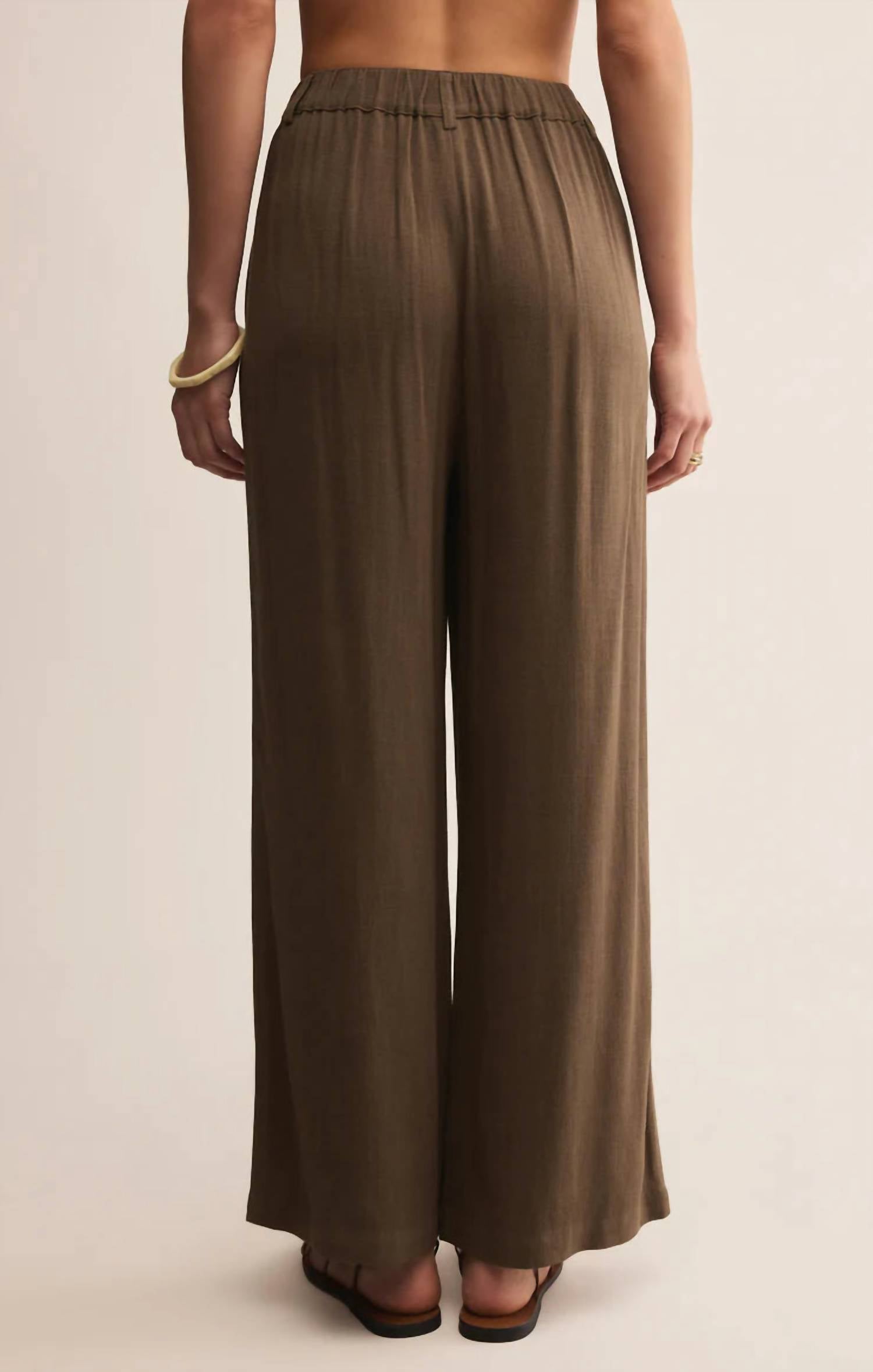 Introducing the Vista Pant in Tavern Brown by Z Supply, the perfect addition to your minimalist wardrobe. These wide-leg pants feature a regular fit with a mid-rise waist and ankle length, crafted from a textured blend of 86% Rayon and 14% Linen for a luxurious feel. Designed for ease and comfort, they include side seam pockets and a secure zip fly with button closure. For care, simply machine wash cold inside out, hang to dry, and warm iron if needed. Inseam: 27.5".