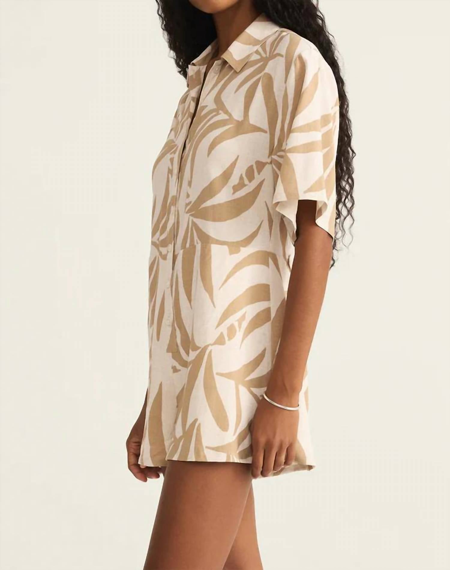 It doesn't take much for this one piece to look effortlessly cool. Add some statement jewelry to dress it up, or throw on some sneakers for a more casual vibe. Embrace the essence of summer, perfect blend of tropical flair and effortless style in Santal. Patterned romper features short sleeves and an adjustable waist, ensuring a relaxed fit for all-day comfort. Crafted from a blend of 85% Viscose and 15% Linen, fully lined for added quality. Button front. Hand wash cold separately and hang to dry or opt for dry cleaning.