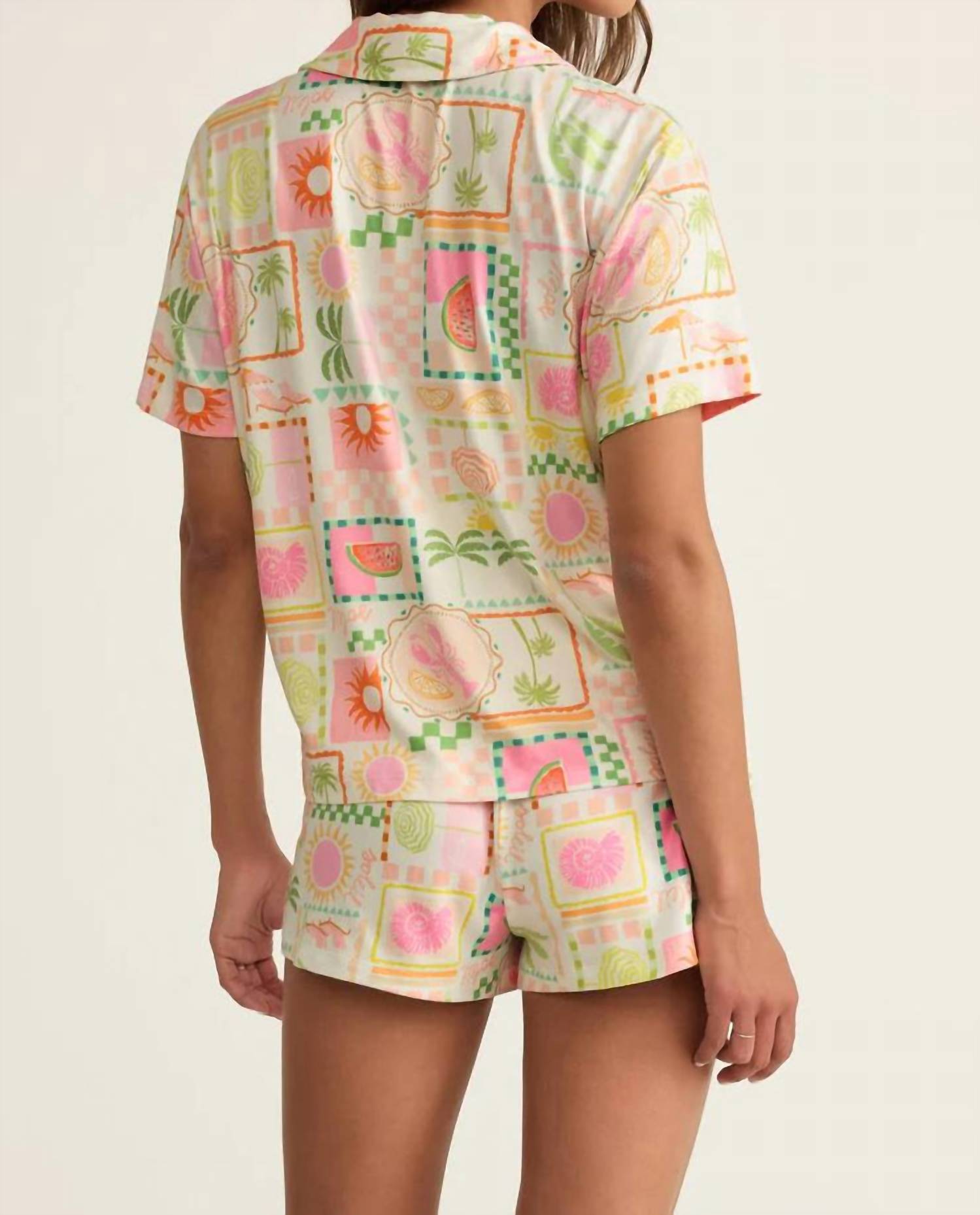 A timeless blouse that will never go out of style. Say hello to summer style with the Beach Days Soleil Shirt by Z Supply, crafted for a relaxed and playful look. This sleeveless, multicolor top features a lively patterned design with a classic collar and convenient button closure. Made from silky jersey comprising 95% Polyester and 5% Elastane, it ensures all-day comfort in a trendy maximalist fashion. Care is a breeze with its machine wash cold, gentle cycle requirement, and option to tumble dry low or lay flat to dry.