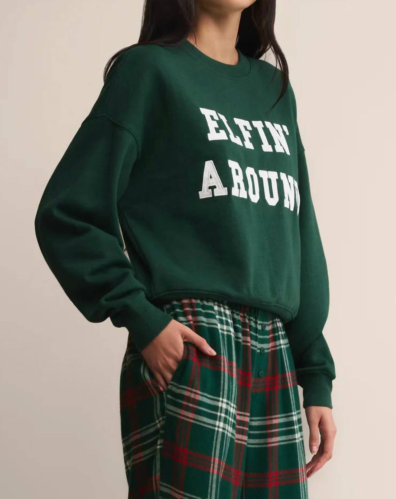 Cooler temps call for layering and we love this adorable sweatshirt for all the obvious reasons. Introducing the Holiday Crewneck Sweatshirt by Z Supply, perfect for bringing playful energy to your cozy moments. This mistletoe-colored sweatshirt features long sleeves and is crafted from a soft fleece blend of 60% cotton and 40% polyester, providing a lived-in feel from the first wear. With a pull-on closure type, the design is accentuated by a collegiate "Santa's Helper" twill applique. Designed for easy care, it's tailored for machine wash cold, gentle cycle, and low tumble dry or flat drying.