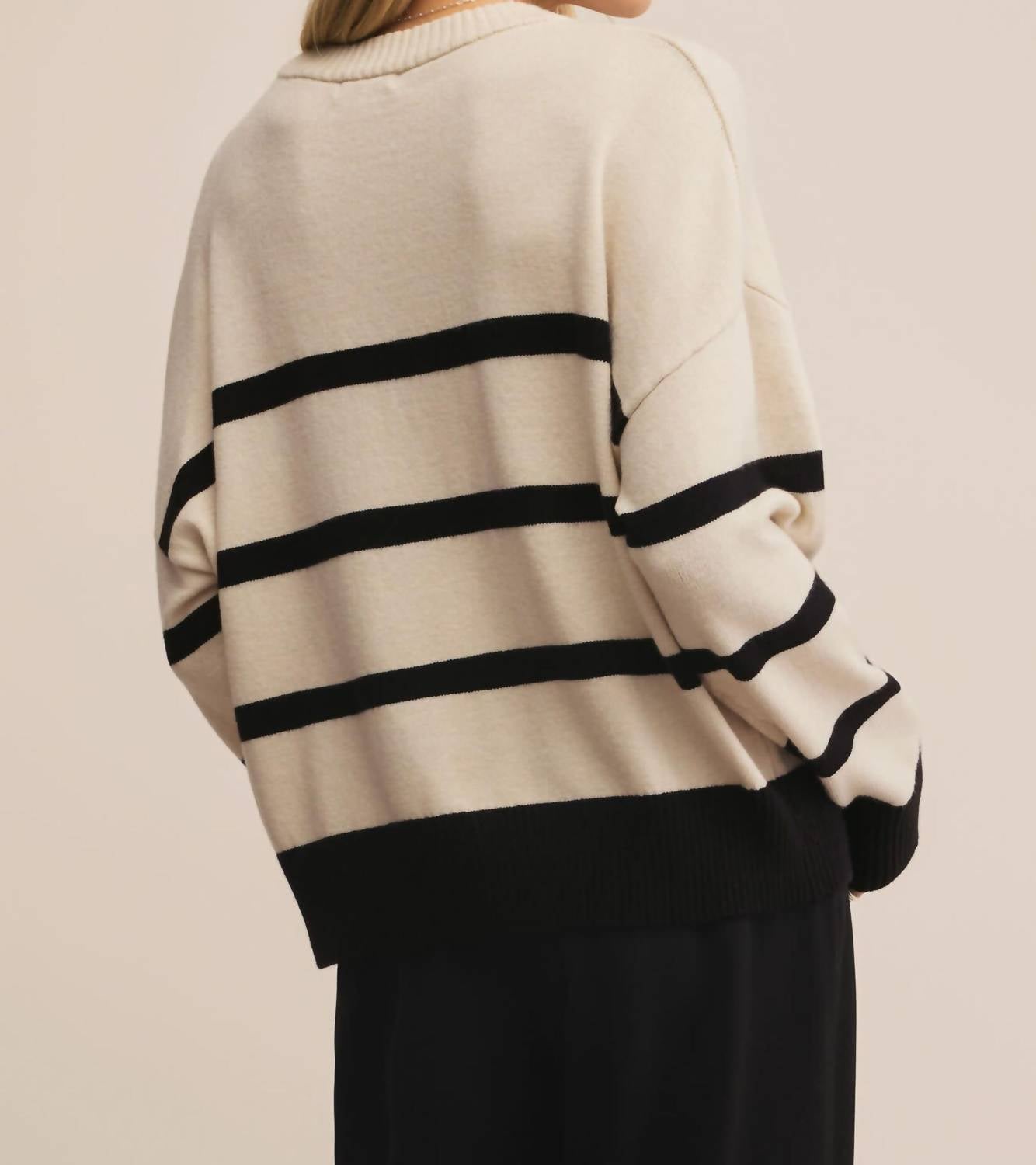 The ultimate go-to sweater, expertly crafted to provide the perfect combination of warmth and style. Its classic design and soft fabric make it a must-have addition to your wardrobe. Introducing the Jordane Stripe Sweater by Z Supply, a must-have for 90s fashion lovers seeking effortless style this fall. Featuring long sleeves and a comfortable crewneck, this relaxed fit piece is crafted from Dancer Yarns 4x2 Rib: 52% Viscose, 26% Polyester, and 22% Nylon. With a lightweight composition and a heavy soft wash, it offers a cozy feel, while its length from shoulder is 21 1/2", perfect for a casual vacation look. Closure: Pull on.