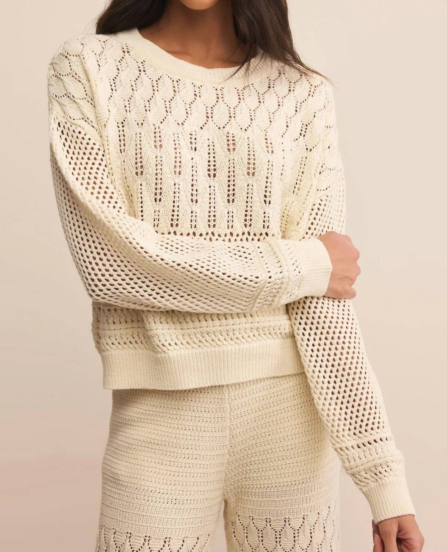 Experience the perfect blend of comfort and style with this trendy crew neck sweater, designed to effortlessly elevate your wardrobe. Pair it with your favorite denim and loafers for the perfect look. The Marine Street Knit Sweater by Z Supply is an essential addition to your fall wardrobe, offering a beige hue with a minimalist, textured design. This relaxed crochet sweater features long sleeves and a crewneck, making it perfect for layering during your seasonal travel adventures. Crafted from 77% Cotton and 23% Nylon, its cropped silhouette and pull-on closure add to the sweater’s airy and versatile appeal. Ideal for pairing with high-rise denim or dresses, this sweater runs true to size and is available in sizes XS to M. Model is 5'8" and wearing size extra small.