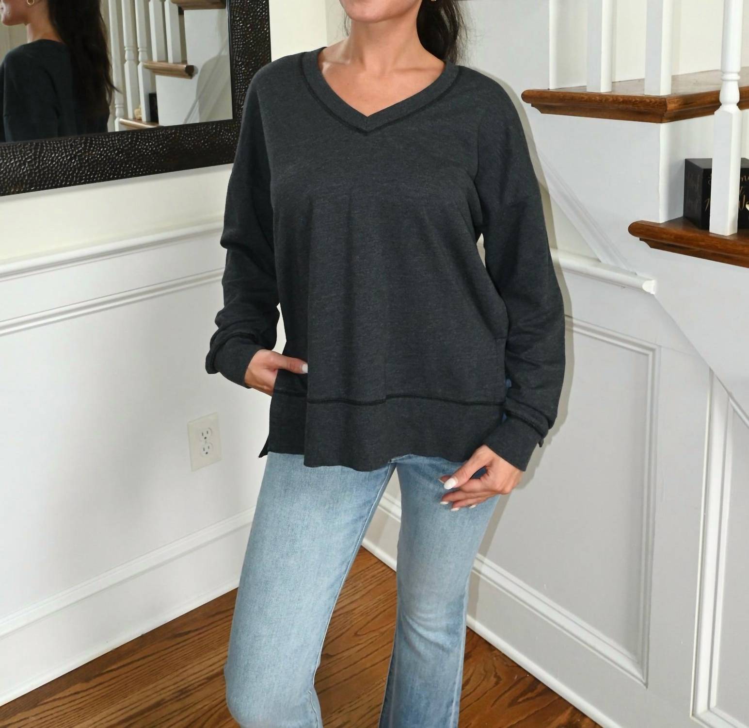 Experience the perfect blend of comfort and style with the Z Supply Modern V Neck Weekender Sweater in Jet Black. Crafted from a baby French terry fabric with 60% cotton and 40% polyester, this long sleeve piece offers an oversized fit ideal for casual fall outings. Closure comes in a convenient pull-on style, featuring a distinguished v-neckline. This solid, mid-weight sweater requires cold machine wash and should be laid flat to dry, making it perfect for travel and preppy Thanksgiving events.