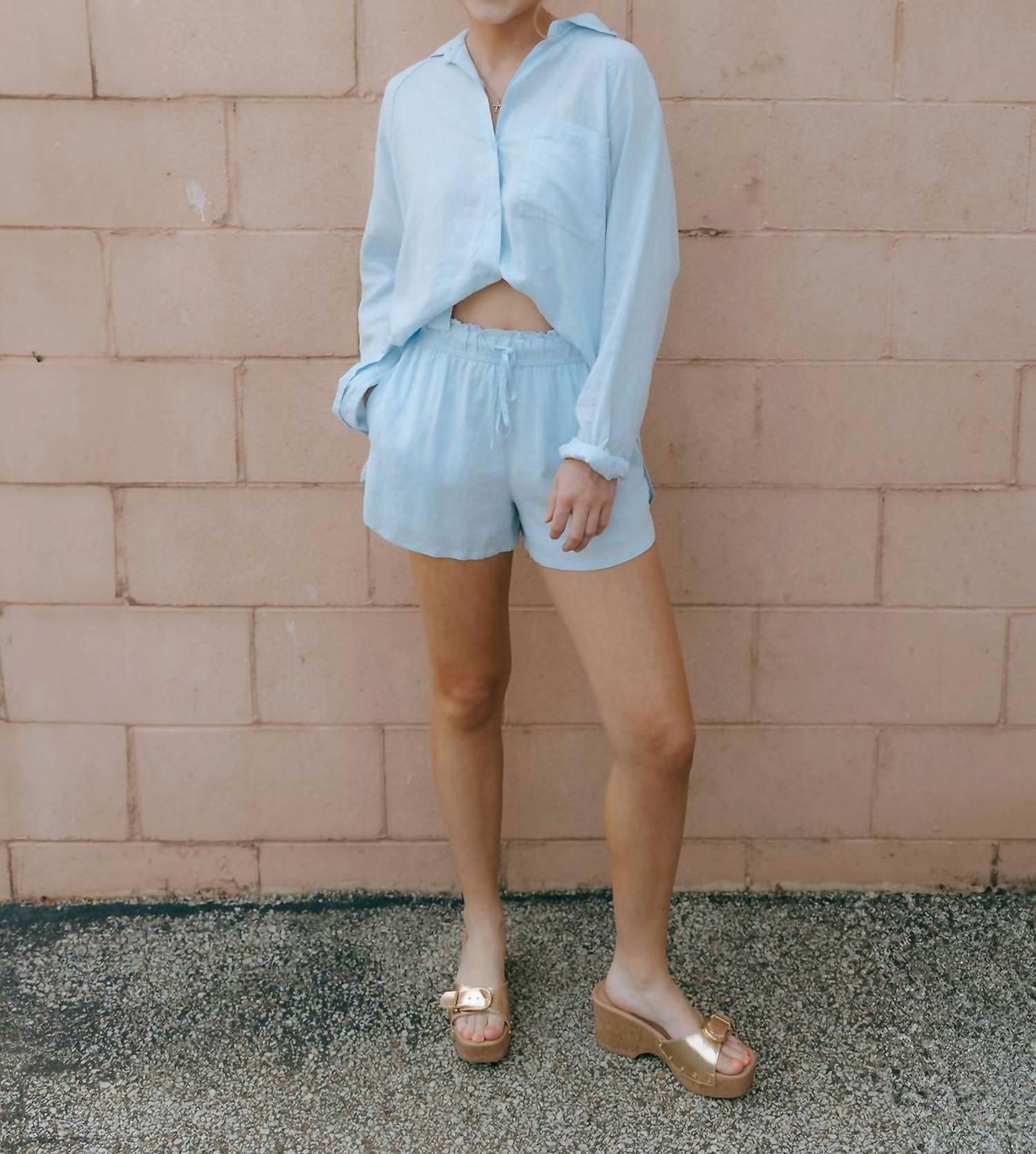 Tuck your favorite tee into these high-waist shorts for a more casual-cool feel. Introducing the Perfect Mid-high Rise Linen Shorts by Z Supply in a refreshing Salt Water hue, ideal for your next vacation ensemble. These shorts boast a blend of 55% linen and 45% rayon for a breathable, lightweight feel, equipped with a mid-high rise fit, elastic waistband, and an adjustable drawstring. Designed for versatile comfort, they feature a solid pattern and pull-on closure, complete with practical pockets. Care for this spring staple by hand washing and laying flat to dry, ensuring longevity in your athleisure collection. Measurements for size XS: 10 1/2" length, 2 1/2" inseam, 26" waist.