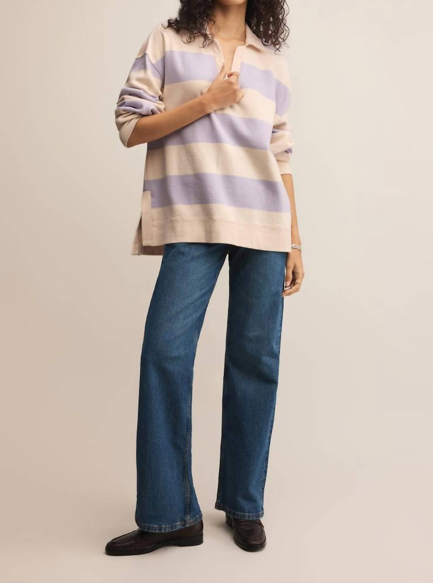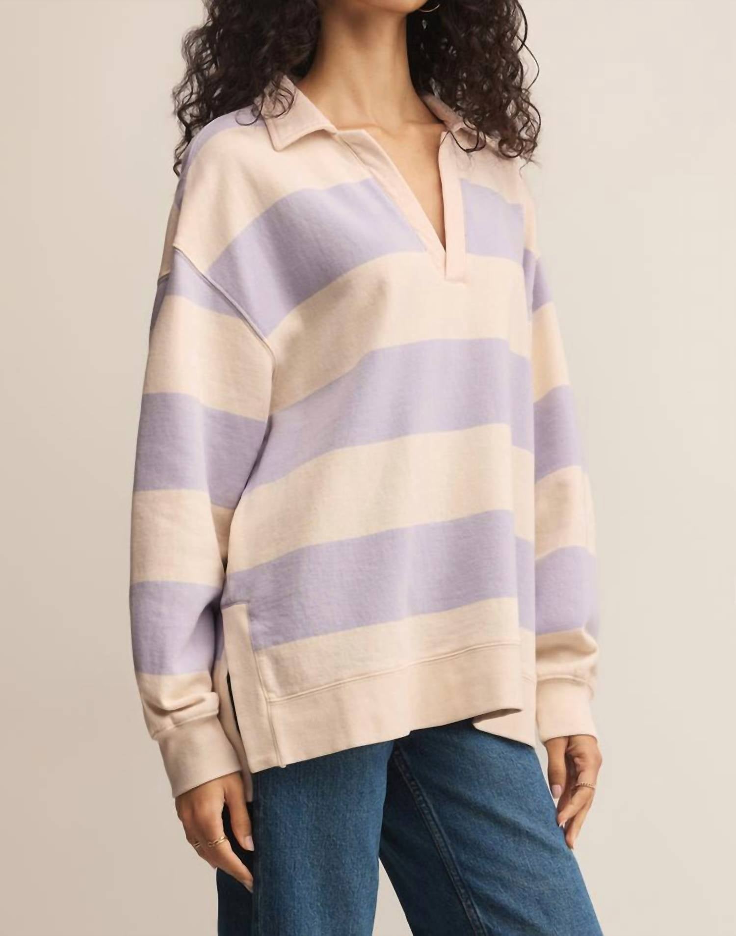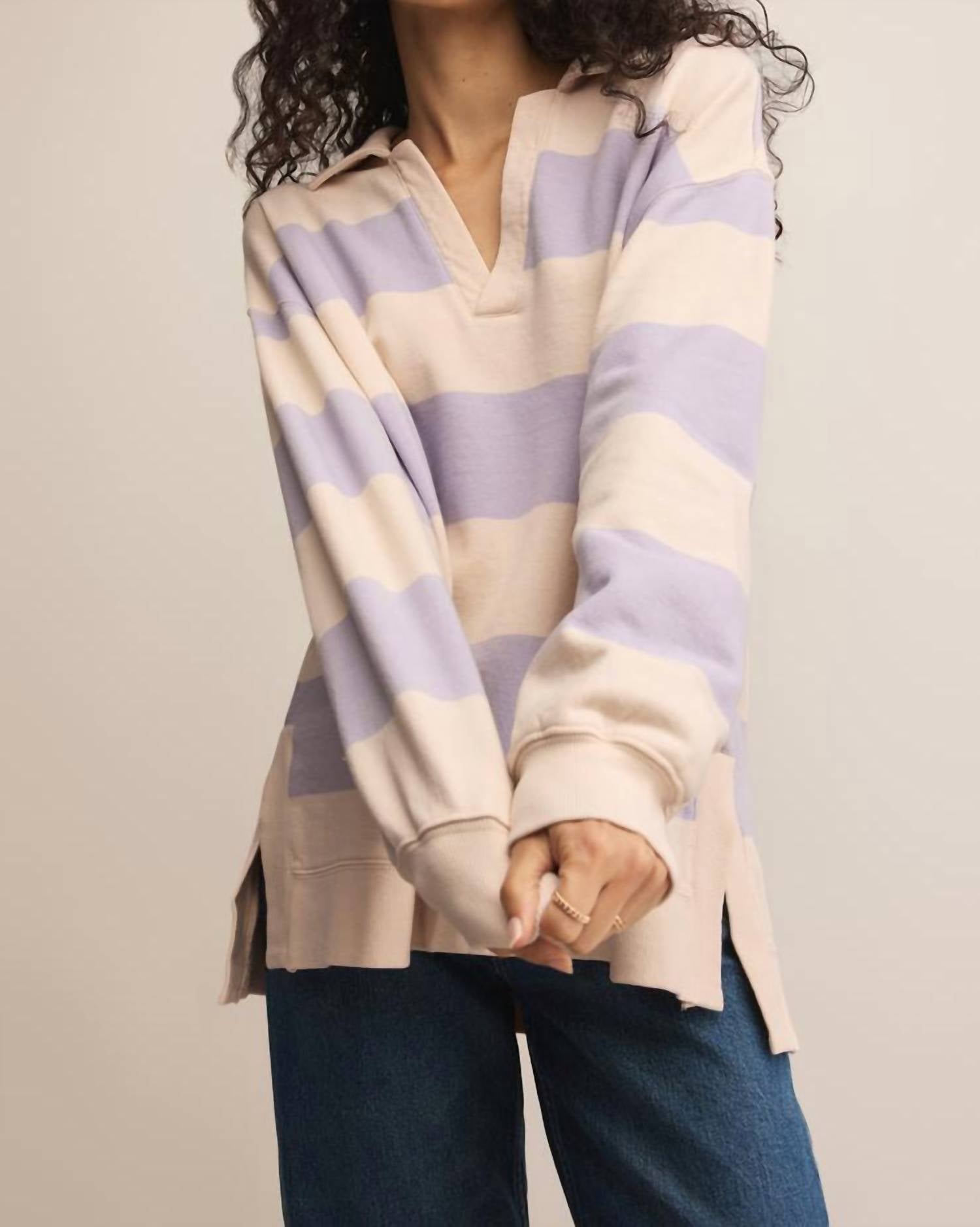 Cooler temps call for layering and we love this adorable sweatshirt for all the obvious reasons. Indulge in the Rugby Brushed Fleece Henley Top by Z Supply, an essential for cozy travel days and casual Thanksgiving gatherings. Crafted from 100% cotton brushed fleece, it features long sleeves, a V-neckline, and a hi-low hem with drop shoulders. Its lightweight design and pull-on closure offer a relaxed silhouette and make it perfect for layering. Care for this striped lavender ice staple with a cold machine wash on gentle and line dry for best results.