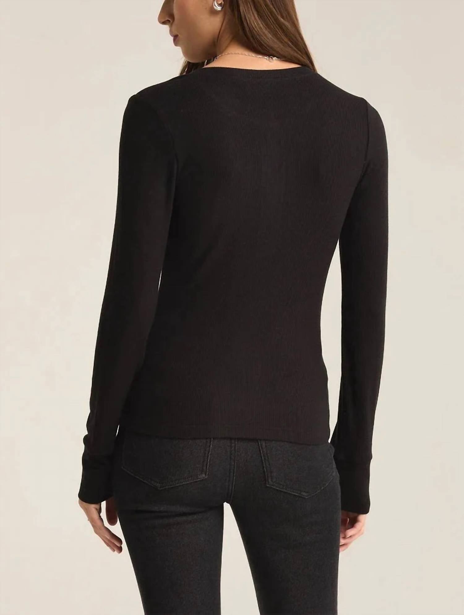 Great fit, cute design, soft fabric. You'll love everything about this long sleeve tee. Introducing the Scarlett Ribbed Long Sleeve Henley by Z Supply, the perfect addition to your wardrobe this spring. This solid black top features a V-neckline and long sleeves, crafted from a soft, midweight brushed rib fabric composed of 94% Rayon and 6% Spandex. Designed for ultimate comfort and style while traveling, it offers a pull-on closure for easy wear. Care is simple with machine wash cold, hang to dry, and a cool iron if needed.