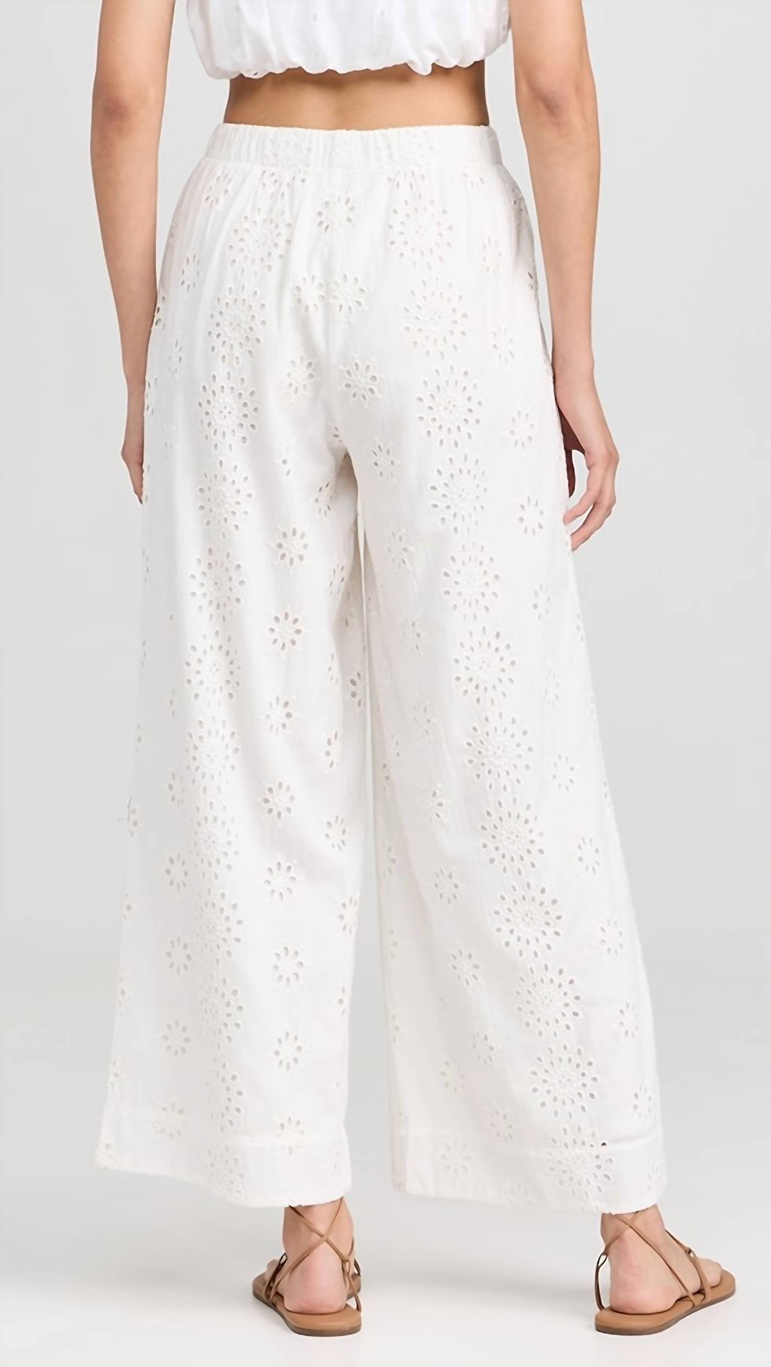 Introducing the Sorrento Eyelet Pant by Z Supply, an elegant addition to your wardrobe in a serene Sandstone hue. These pants offer a relaxed fit with a wide leg and hit at ankle length, featuring a comfortable pull-on closure with a covered elastic waist and drawstring. Crafted from lightweight, non-stretch 100% cotton eyelet fabric, these pants are fully lined for added comfort. Care instructions include washing cold and tumble drying, and they are thoughtfully designed with an 11" rise and a 27.25" inseam.