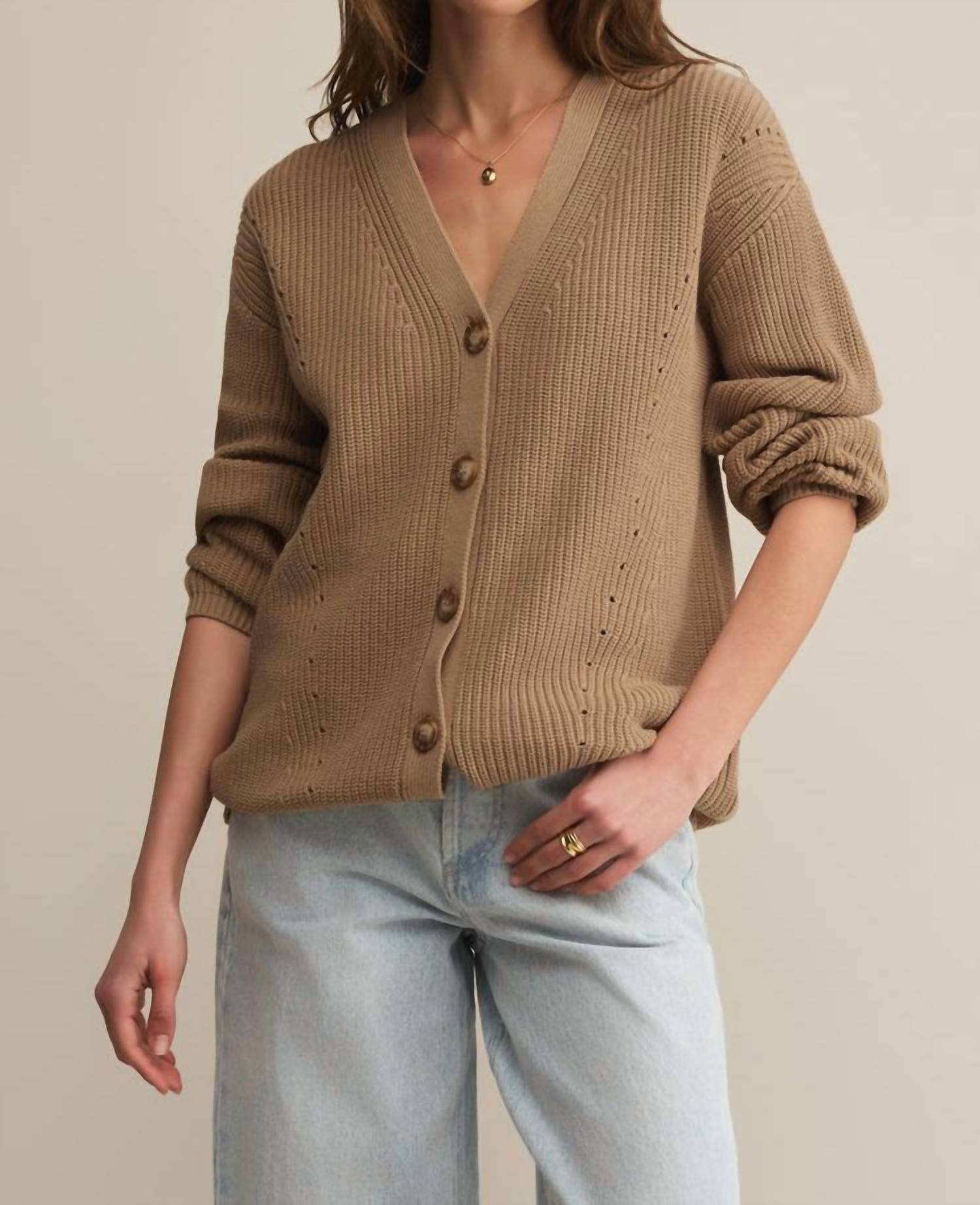 This cardigan will be a sweater-rotation favorite. Embrace minimalist style with the Voyager V-neck Cardigan by Z Supply, the perfect addition to your fall wardrobe. This Desert Tan cardigan features a textured pattern and long sleeves, providing a relaxed fit for easy layering. Made from a sweater knit blend of 94% cotton and 6% nylon, it offers a soft, midweight feel. Closure: Button front. Care: Machine wash cold on a gentle cycle, hang to dry.