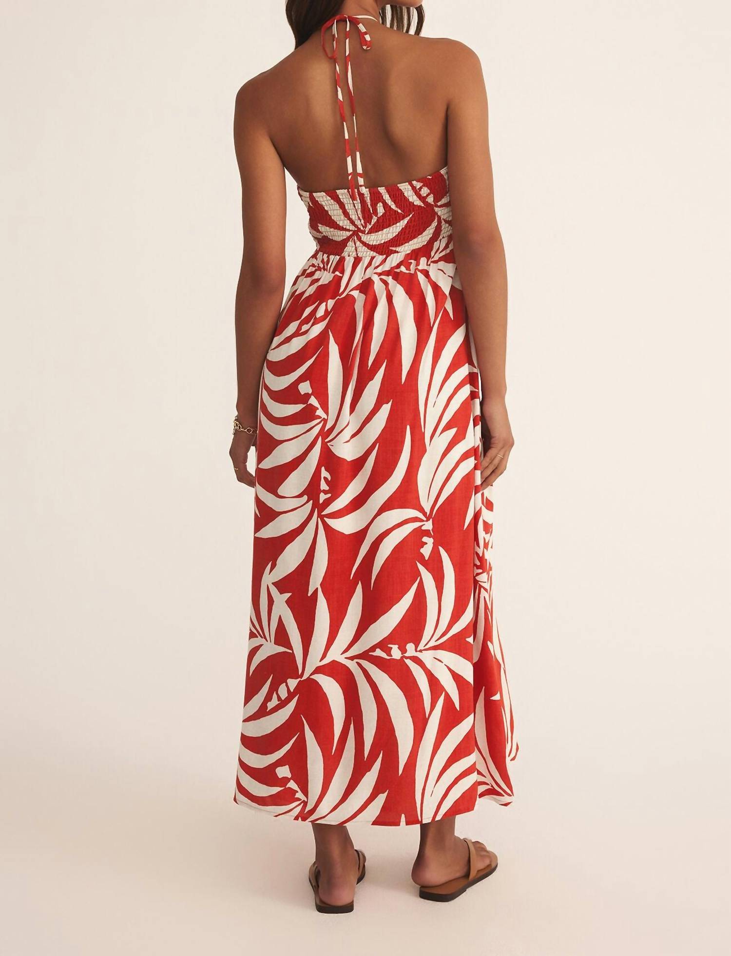 The pefect long sleeve dress for those cooler months. Introducing the Women's Elodi Vacances Midi Dress by Z Supply, a quintessential choice for summer vacations. This sleeveless dress, crafted from 85% Viscose and 15% Linen with a Rayon lining, features a bandeau neckline and a boho chic tropical pattern in vibrant Cabana Red. With a relaxed A-line silhouette and heavy soft wash, it offers a comfortable and stylish fit, complete with a center tie closure and silicone gripper tape for extra support. Care: Hand wash cold separately, hang to dry or dry clean.