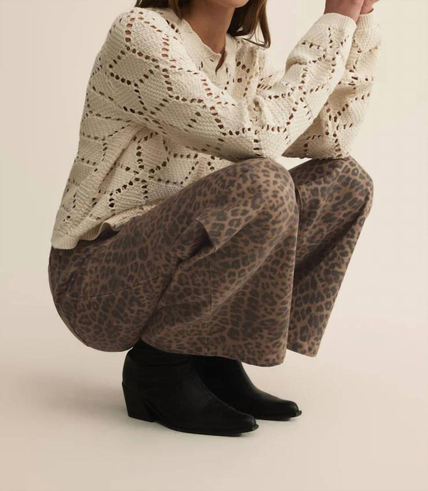 The Women's Marli Denim Leopard Pant by Z Supply offers a trendy utility-inspired design. Made from structured 100% cotton denim, these pants feature a high-rise waist and a full-length wide leg for a modern silhouette. The zip fly with button closure adds practicality, while the bold Desert Tan leopard print enhances your style. Care is simple with machine wash cold on a gentle cycle, and hang to dry.