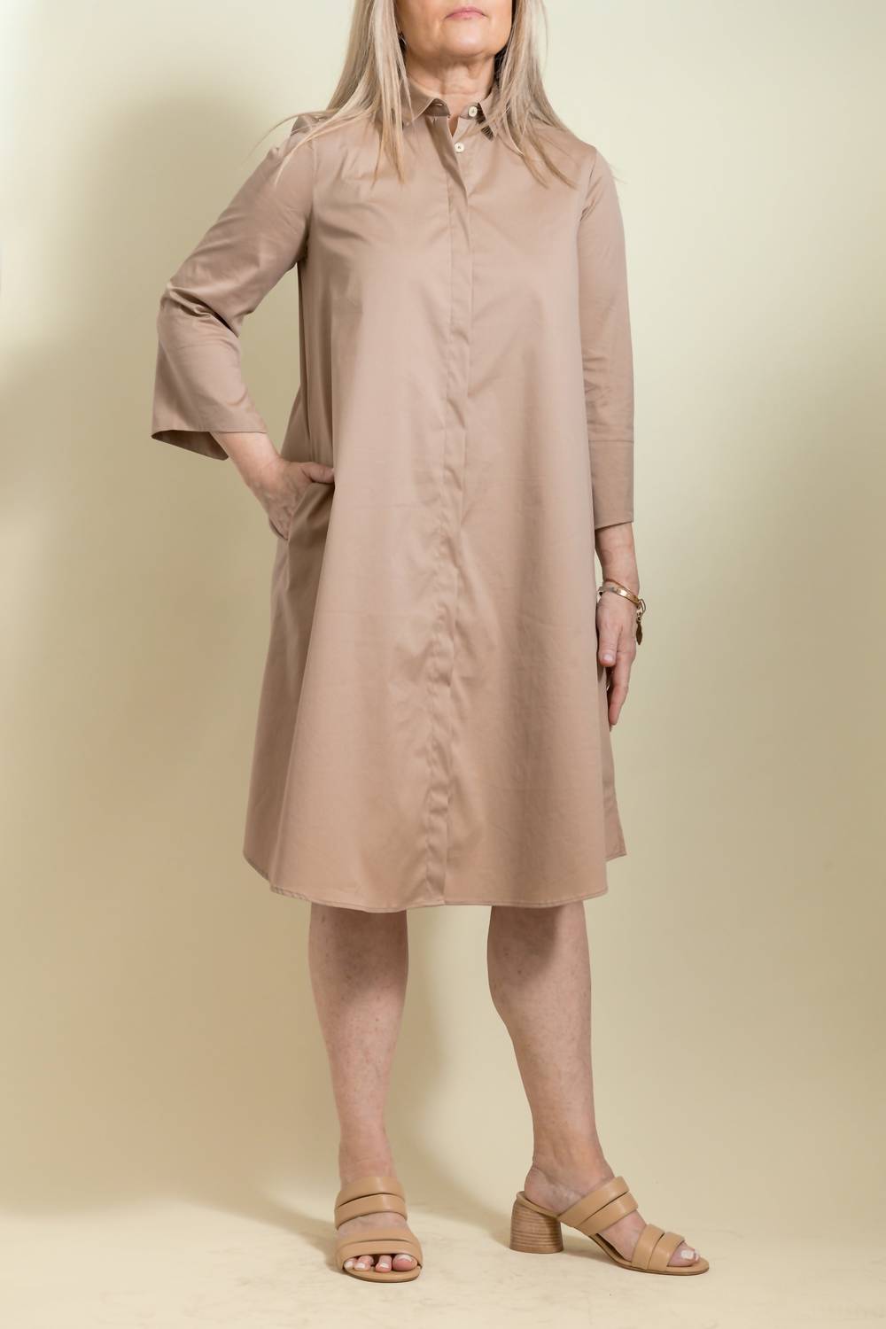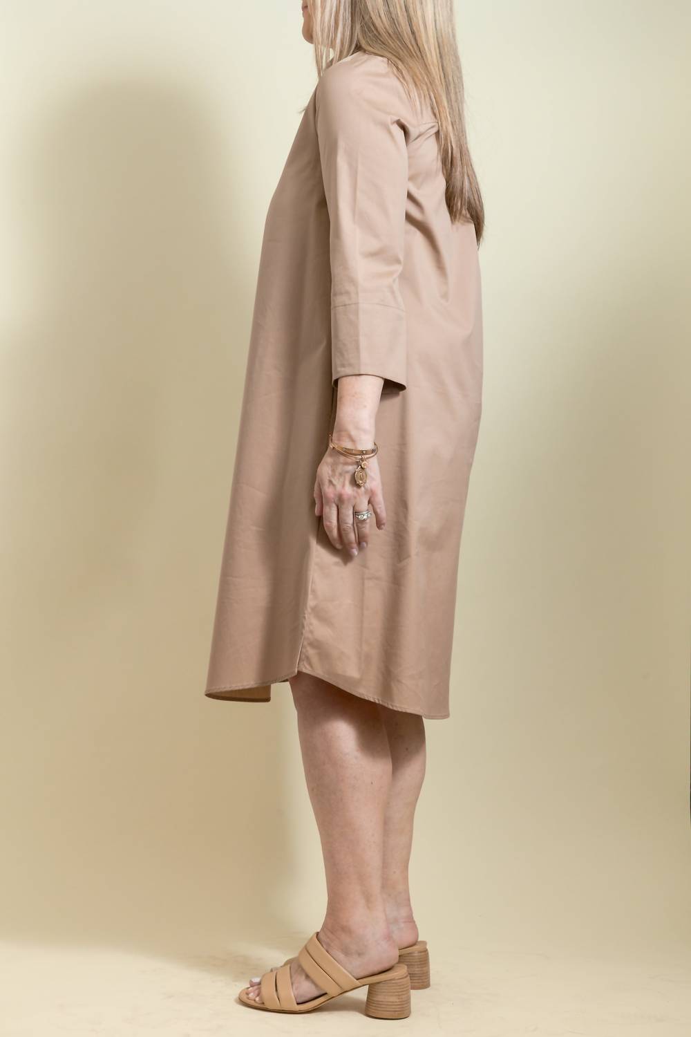 Just add slides or mules and you are good to go. Discover the Gracy Midi Dress by 0039 Italy, exuding sophistication with a nod to Mediterranean style. Designed in a versatile camel hue, this shirt dress features three-quarter sleeves and a classic collar. Crafted from a cotton blend (75% Cotton, 25% Polyamide, 5% Elastane), it includes pockets for added functionality and closes with buttons. Care instructions recommend machine washing cold, line drying, and low ironing to maintain its elegance. Styled for a cocktail party, this dress runs generous in fit, as seen on a model wearing size XXS.