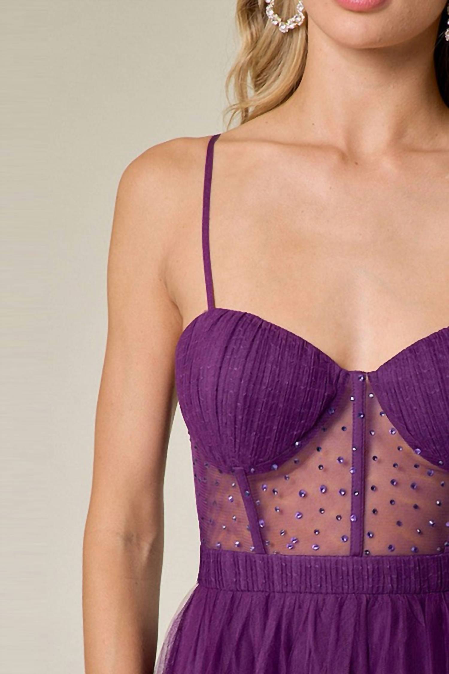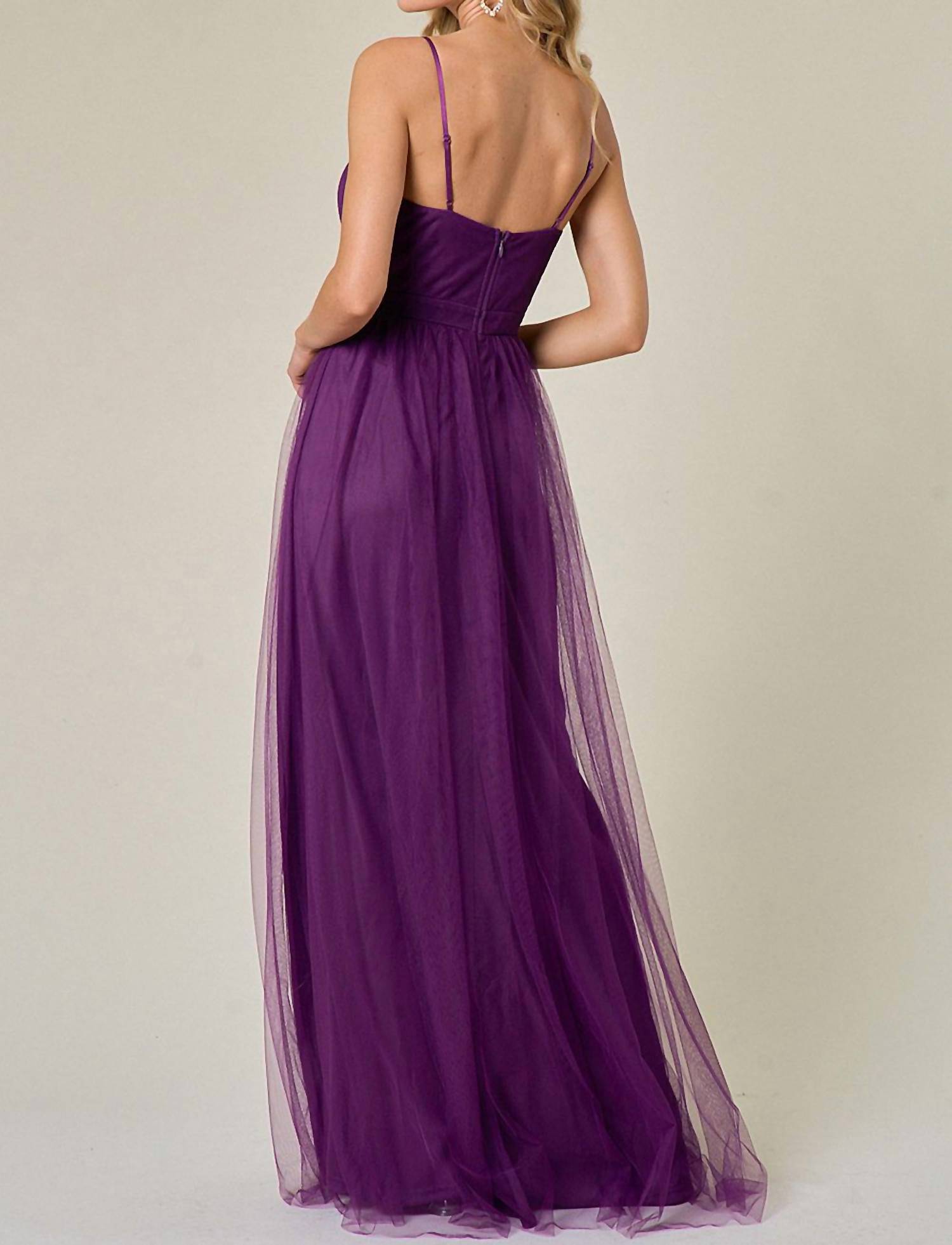 Looking for that perfect event dress? Look no further... Make a statement at your prom with Maniju's Sheer Embellished Tulle Two Slits Prom Dress in a captivating eggplant hue. This glamorous number boasts spaghetti straps and a striking corset top paired with a flowing tulle skirt, offering a dreamy silhouette perfect for the dance floor. Crafted from quality polyester, it features a zip closure for a secure fit. Embrace elegance in this patterned beauty and dance the night away in ultimate style.