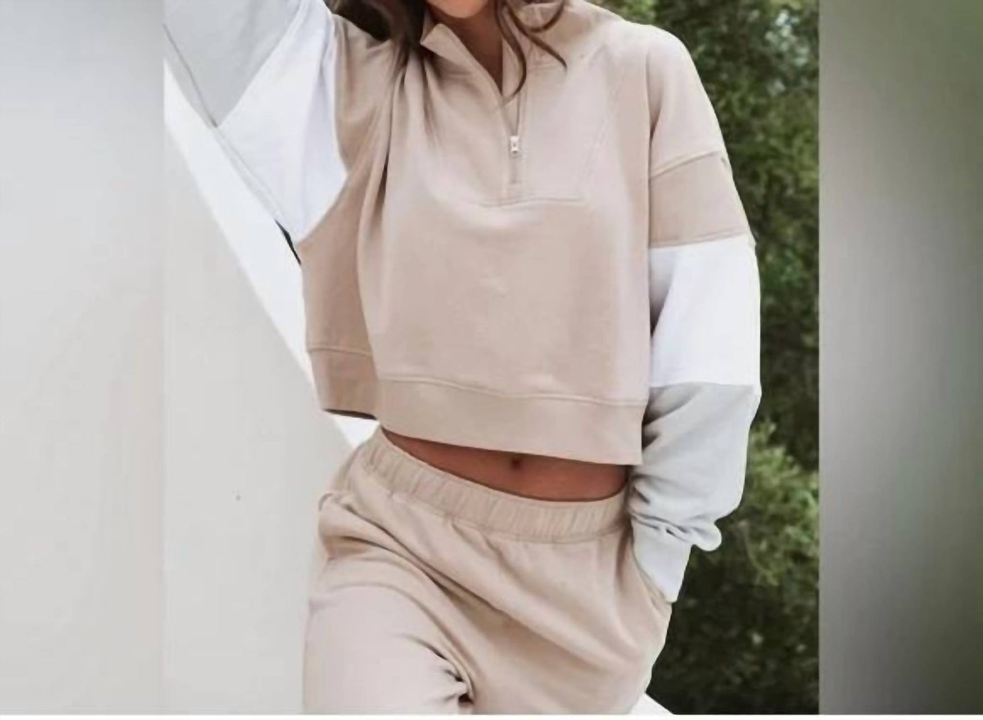 Cooler temps call for layering and we love this adorable sweatshirt for all the obvious reasons. Discover the Plush Half Zip Tri Color Block Sweatshirt by Feat, a stylish addition to any wardrobe with long raglan sleeves and a mock neck. Crafted from supersoft TreeCell Plush fabric, it features a chic colorblock pattern with rib insets at the shoulders, perfect for a preppy look. The cropped body length and oversized fit add to its trendy appeal. Ideal for travel or casual outings, this sweatshirt offers a convenient zip closure and is designed to keep you comfortable and stylish.