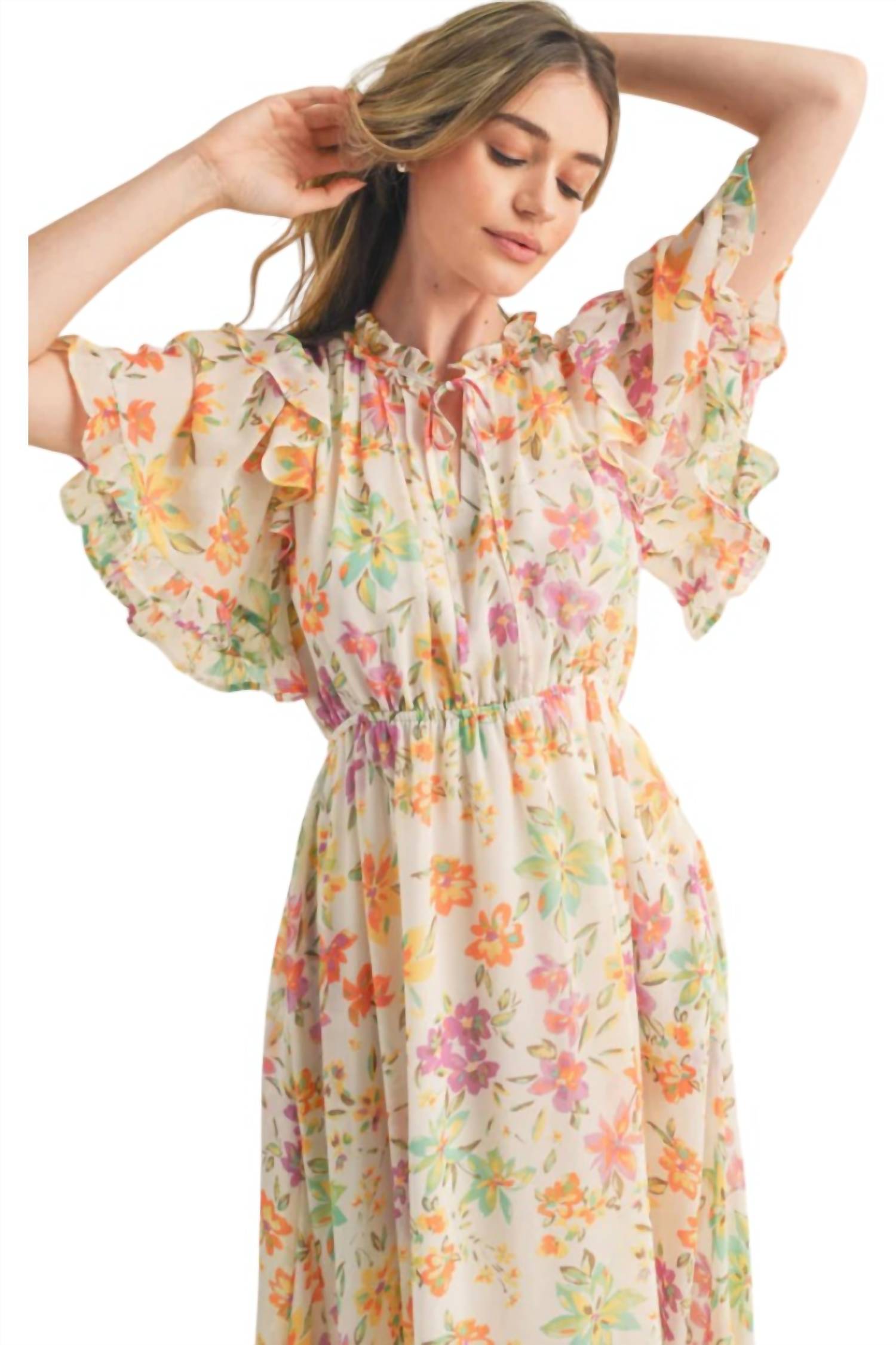 Delightful blend of elegance and comfort. Short-sleeve, lightweight chiffon dress. Features an exclusive colorful floral print. Offers a ruffled tie-front crew neckline and a bodice with an elasticized waist. Finished with a tiered A-line midi hem. Designed in an easy pull-on style.