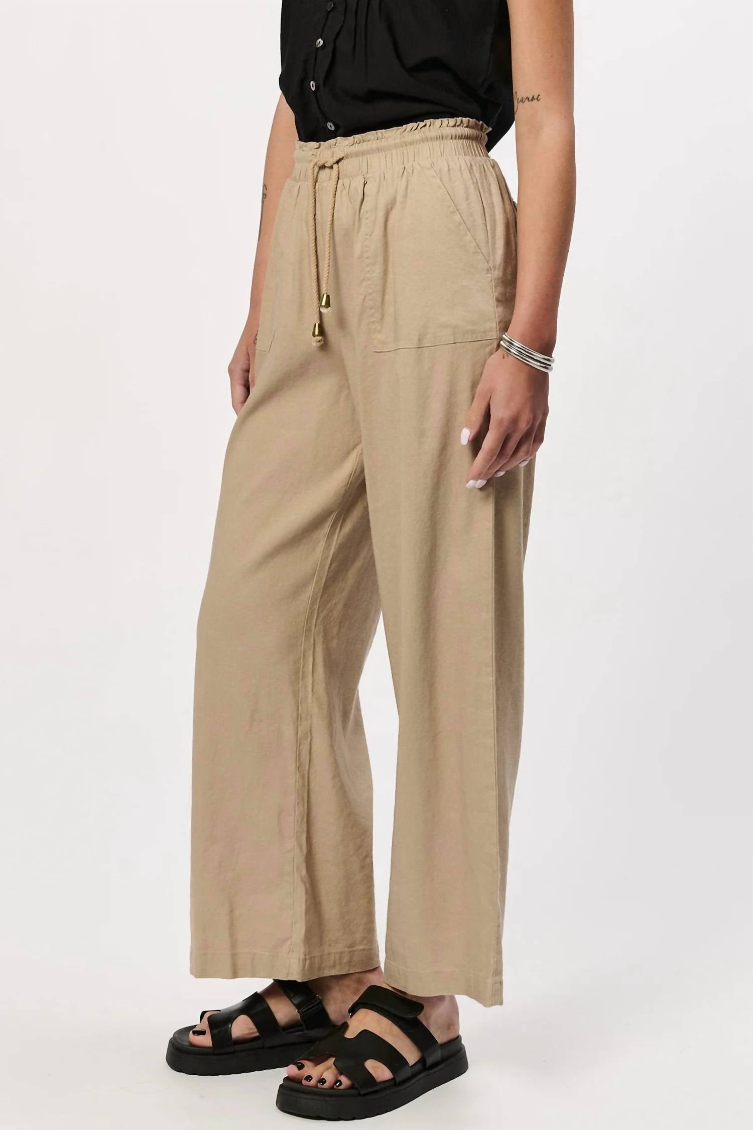 Perfect blend of elegance and ease in a timeless Sandcastle hue. High-rise, wide-leg pants. Crafted from a breathable blend of 55% linen and 45% rayon. Offering a relaxed fit ideal for travel or any springtime occasion. Featuring a solid pattern with a paperback waistband, include an elastic and drawstring for a feminine touch, with practical pockets for added convenience. Pull on closure. Machine wash.