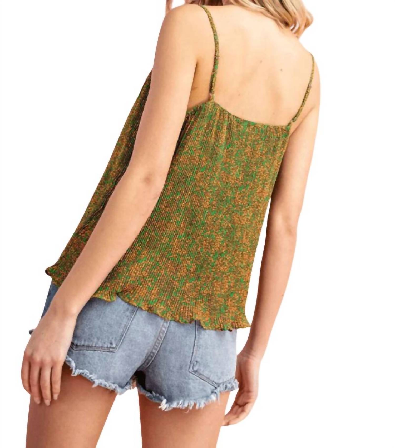 Featuring adjustable spaghetti straps, this airy cami showcases a vibrant multi-print in shades of green and orange. Crafted from 100% polyester, it's lined for added comfort and adorned with decadent plissé pleats. The pull-on closure and v-neckline complete its chic design. Care instructions include washing cold, avoiding bleach, and line drying/low heat.