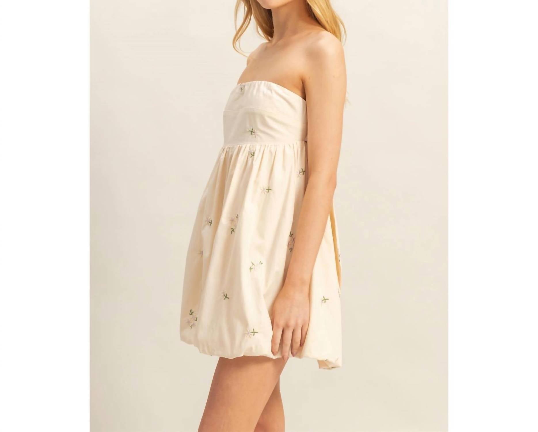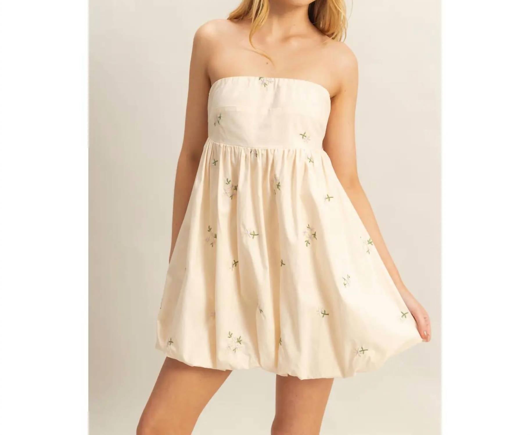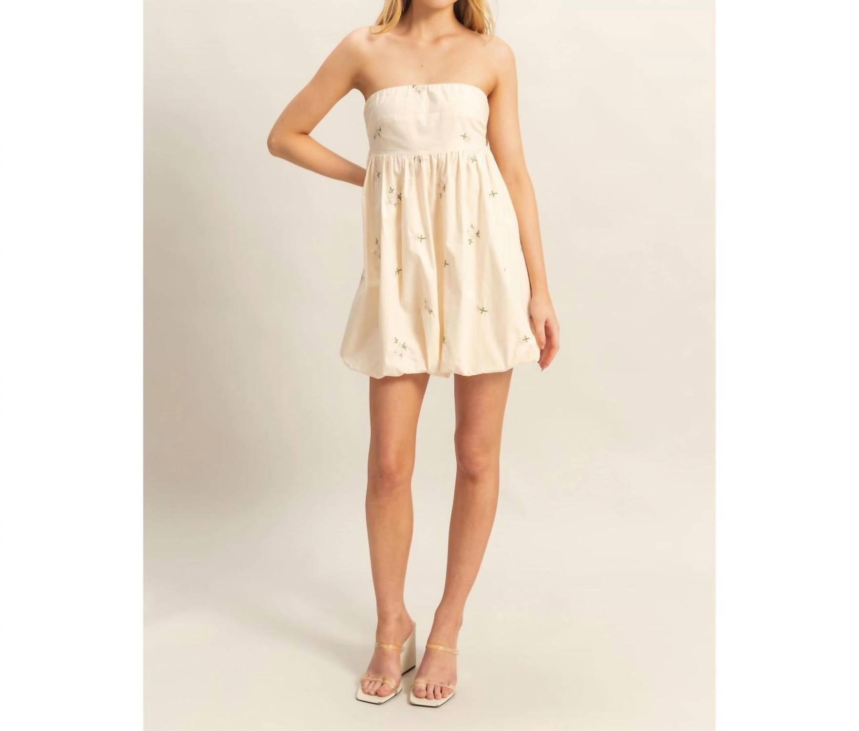 A short and breezy dress for those warmer days. Decorated With Floral Embroidery, This Mini Dress Shapes A Strapless Neckline And A Fitted Bust. The Attached Skirt Offers Gathered Detailing Before Falling Into A Trendy Bubble Hem. The Big Bow At The Back Is The Best Finishing Touch.